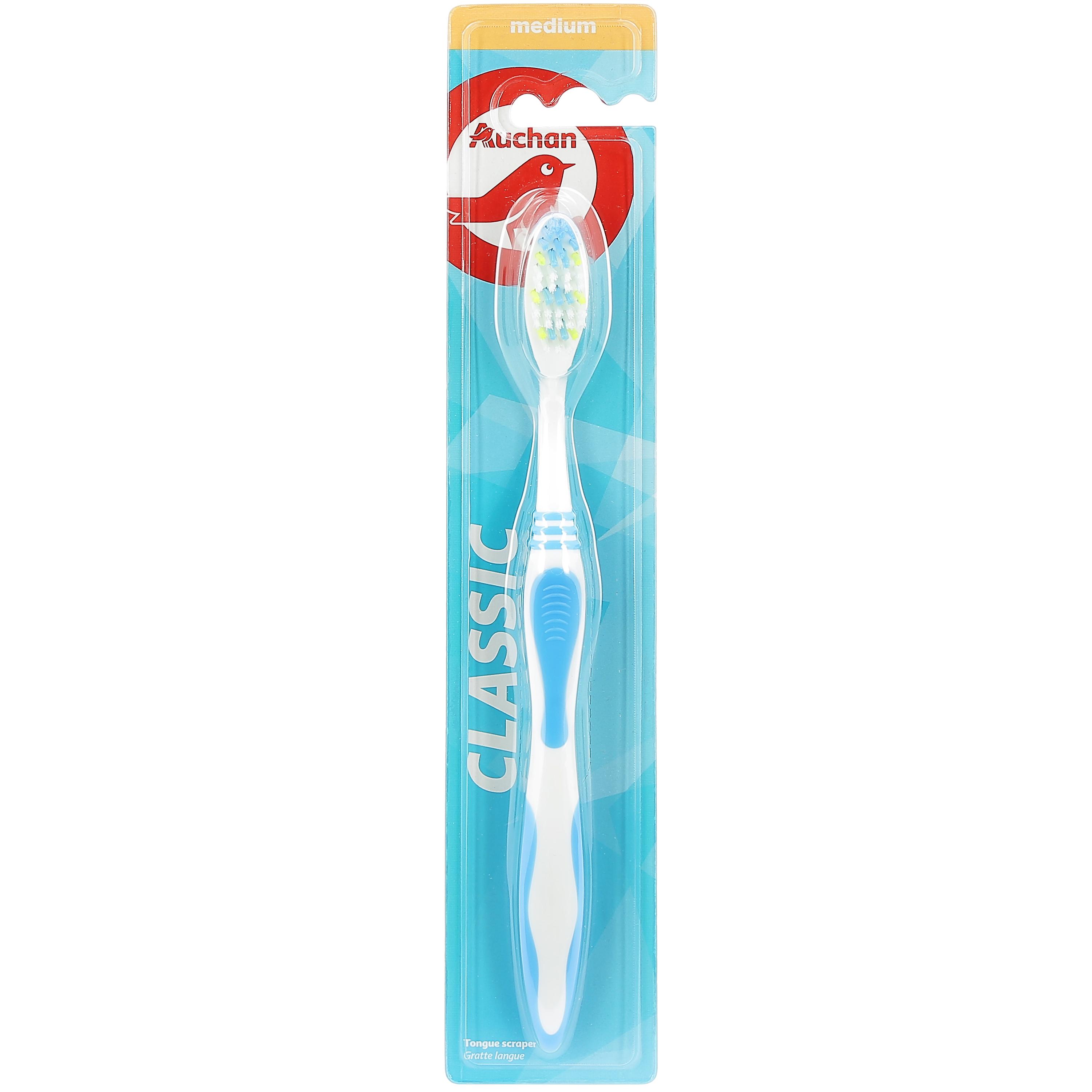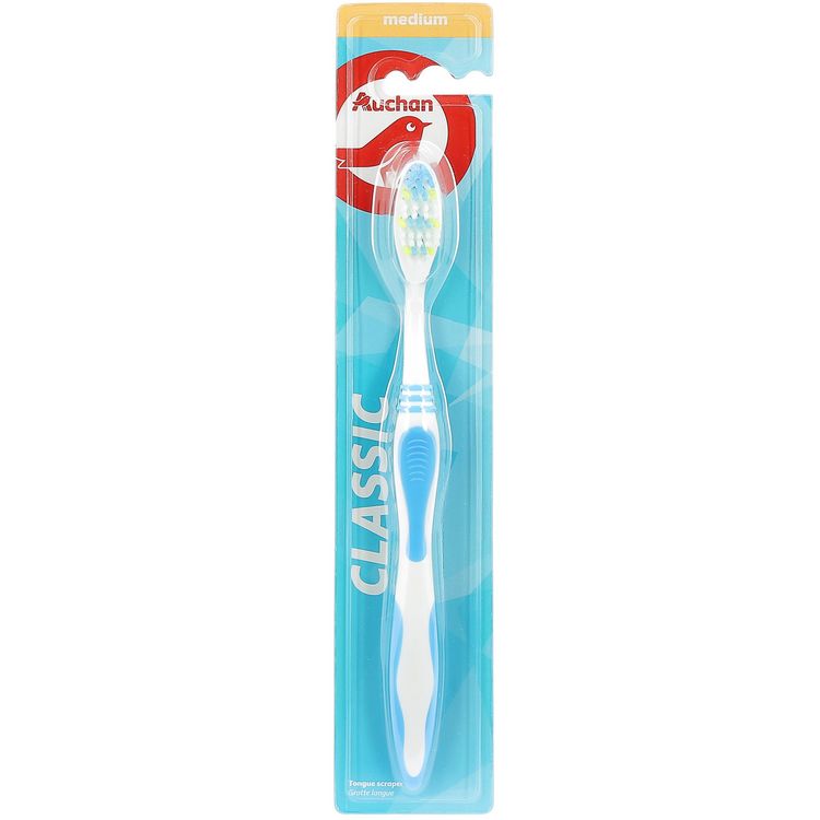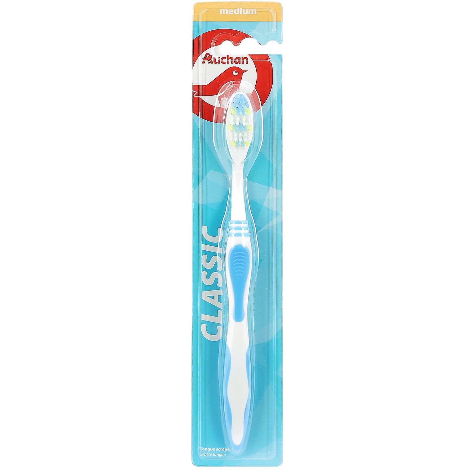 Retrouvez le sourire avec la brosse à dents médium AUCHAN. Le manche ergonomique permet une meilleure prise en main pour une plus grande précision de brossage. Elle aide à combattre la plaque dentaire. Le gratte-langue au dos de la tête permet une hygiène complète de la bouche par son action sur la langue et l'intérieur des joues.