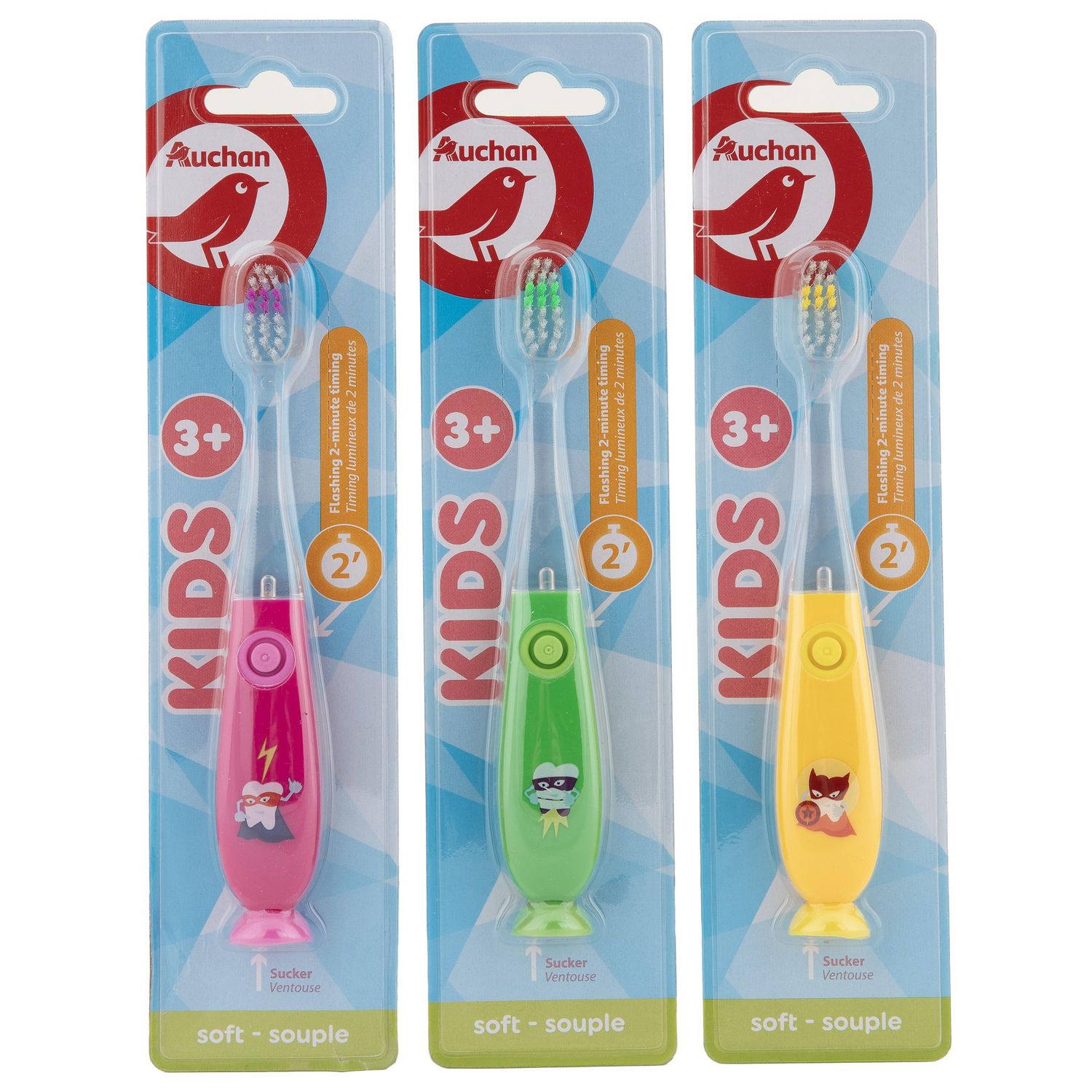 La brosse à dents enfant 3+ Auchan a été spécialement conçue pour les jeunes enfants qui apprennent à se brosser les dents. Elle est dotée d'une petite tête garnie de filaments souples qui permettent un brossage efficace tout en douceur. Son manche est adapté aux petites mains et équipé d'une petite lampe qui s'allume pendant 2 minutes pour indiquer le temps de brossage : le brossage des dents devient alors "un jeu d'enfants". La brosse à dents tient debout toute seule, sur les surfaces lisses de la salle de bain grâce à sa ventouse. Batteries incluses et non remplaçables.