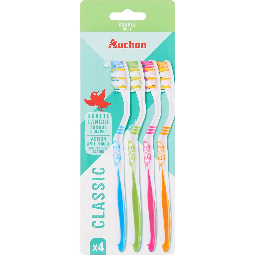 Retrouvez le sourire avec la brosse à dents souple AUCHAN. Le manche ergonomique permet une meilleure prise en main pour une plus grande précision de brossage. Elle aide à combattre la plaque dentaire. Le gratte-langue au dos de la tête permet une hygiène complète de la bouche par son action sur la langue et l'intérieur des joues. Vendues par pack de 4.