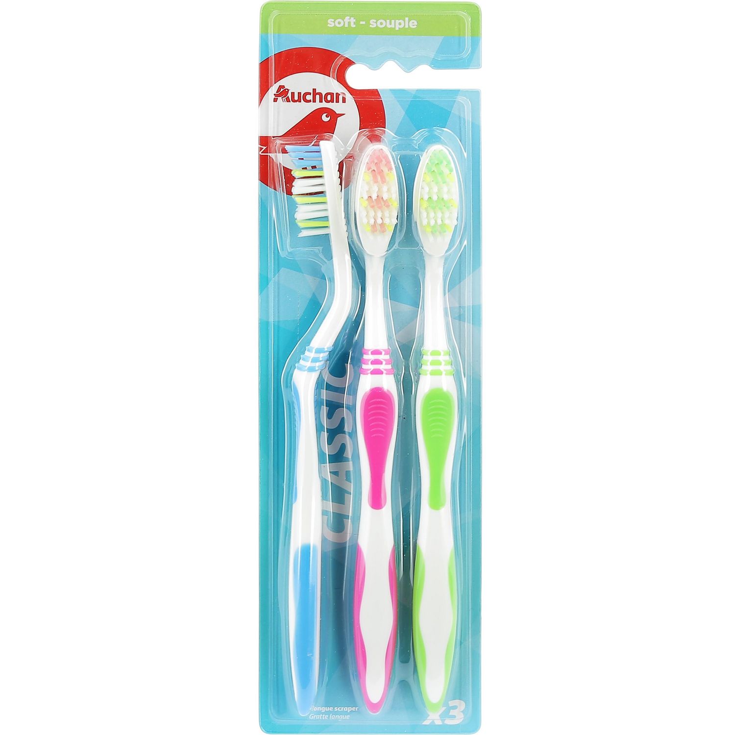 Retrouvez le sourire avec la brosse à dents souple AUCHAN. Le manche ergonomique permet une meilleure prise en main pour une plus grande précision de brossage. Elle aide à combattre la plaque dentaire. Le gratte-langue au dos de la tête permet une hygiène complète de la bouche par son action sur la langue et l'intérieur des joues. Vendues par pack de 3.