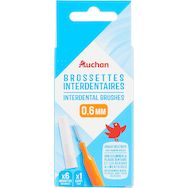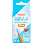 Les brossettes interdentaires AUCHAN s'utilisent en complément du brossage de dents. Faciles d'utilisation, elles permettent de nettoyer les espaces interdentaires les plus étroits que la brosse à dents ne peut atteindre et aident à éliminer la plaque dentaire. 0,6mm