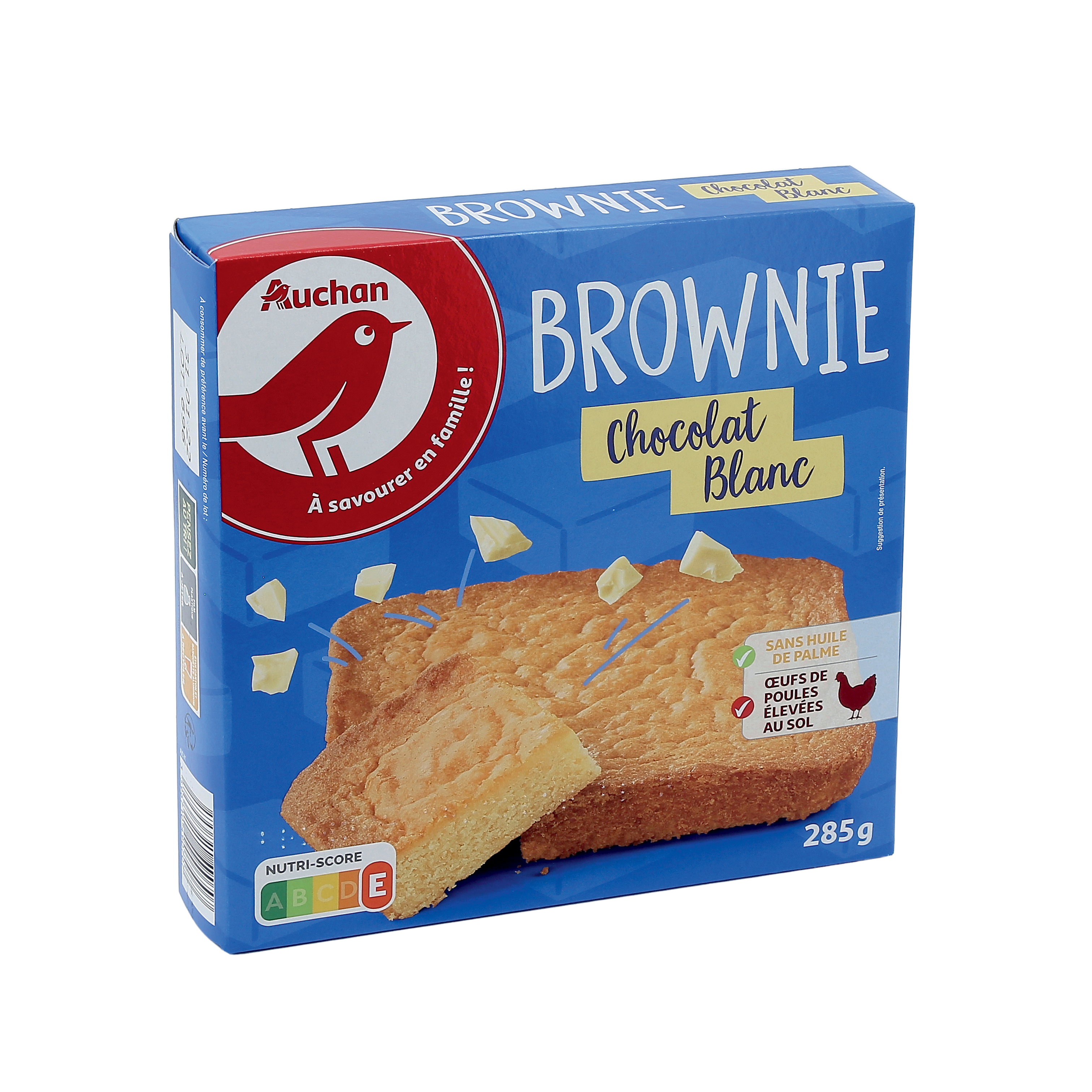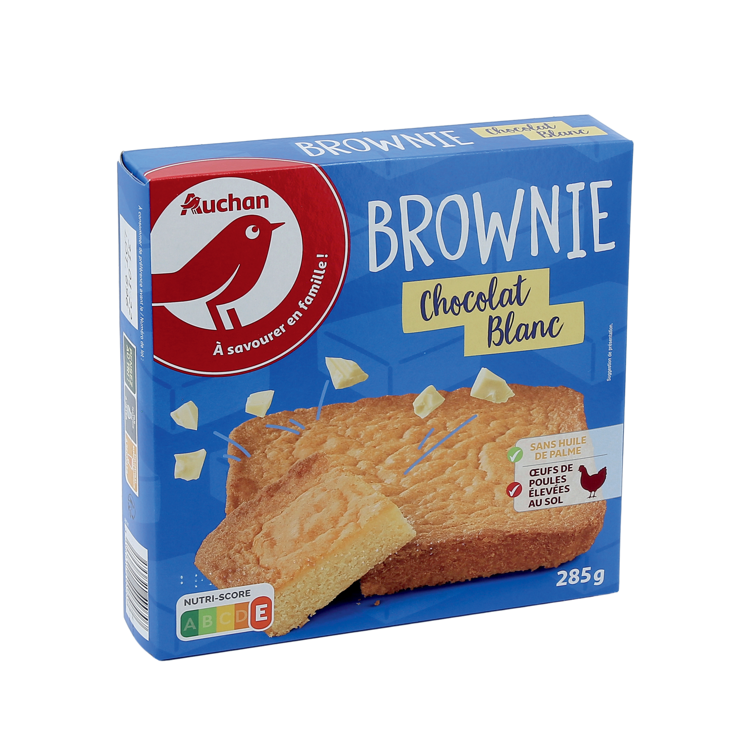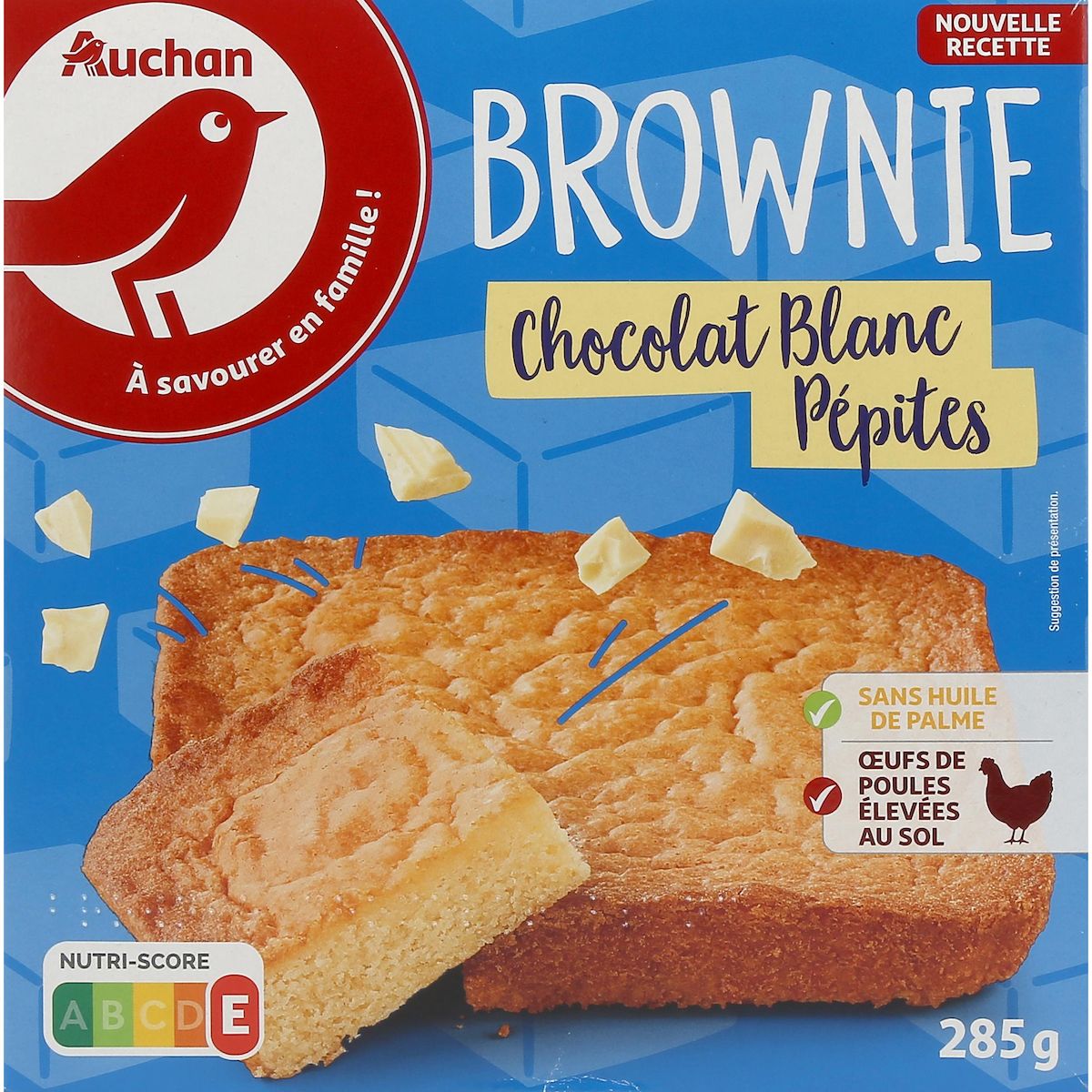 Cette version chocolat blanc vient compléter la gamme des brownies familiaux Auchan 285g : pépites, noisettes et bio.