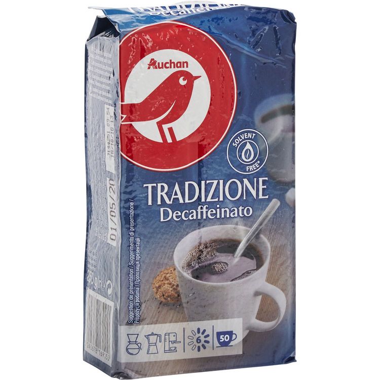 Parce qu'Auchan privilégie le bon et le sain, notre café est décaféiné sans solvant. En plus, cette méthode permet de préserver tout le gout et les arômes ! Alors, convaincu ? Café torréfié décaféiné moulu. Conditionné sous vide.