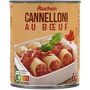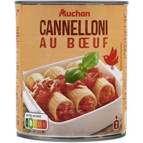 Ingrédients : Eau, cannelloni 30% (semoule de BLÉ dur, viande de boeuf 8% (origine: France), chapelure (contient BLÉ), carottes, eau, oignons, sel, plantes aromatiques, fécule de manioc, huile de colza, arômes naturels), purée de tomate mi-réduite, viande de porc cuite 3,4% (origine: France) (équivalent viande crue 5%), oignons, carottes, amidon, huile de colza, basilic, sucre, sel, arôme naturel, ail en poudre, extrait de poivre. Viandes de bœuf et de porc mises en oeuvre: 13% du poids net total Traces éventuelles de lait, céleri et oeuf.