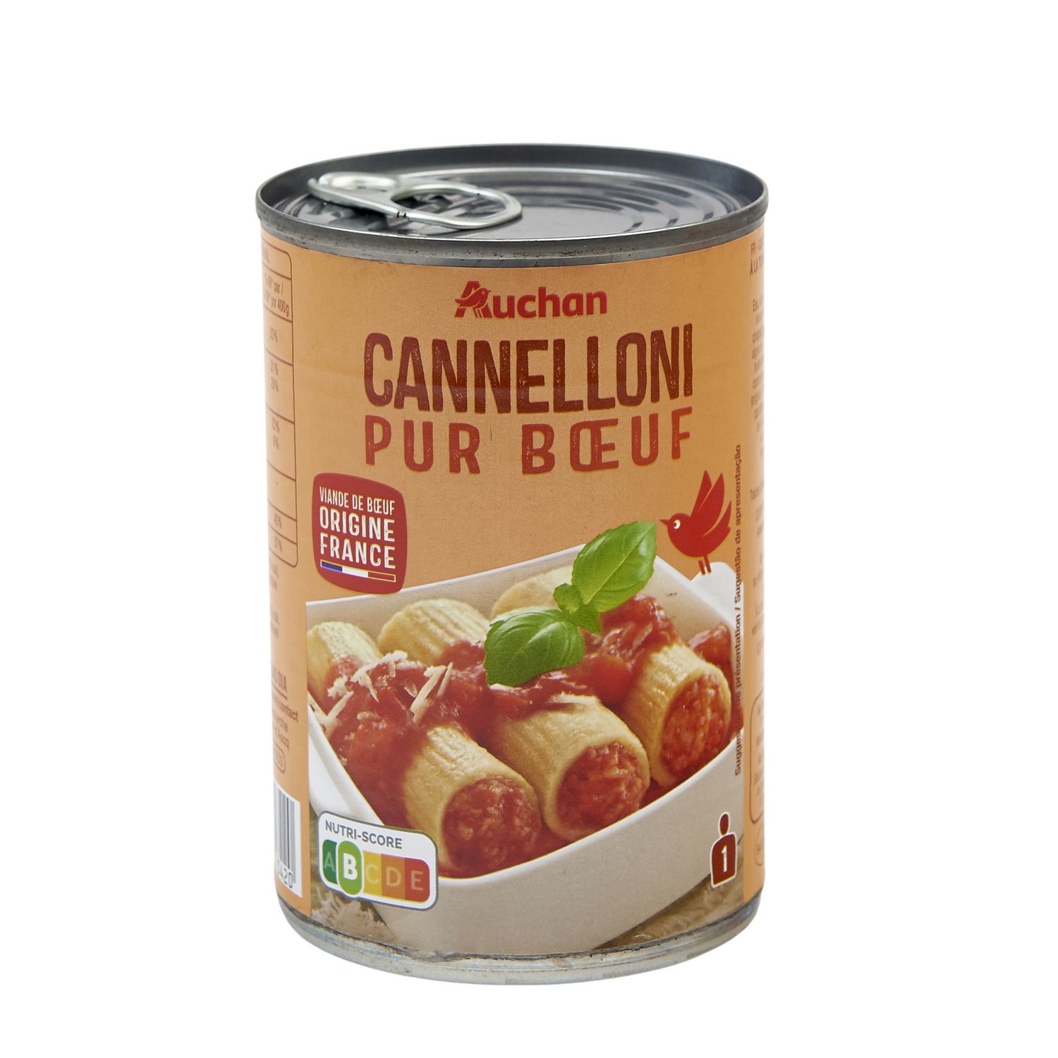 Ingrédients : Eau, cannelloni 30% (semoule de BLÉ dur, viande de boeuf 8% (origine France), chapelure (contient BLÉ), carottes, eau, oignons, sel, plantes aromatiques, fécule de manioc, huile de colza, arômes naturels), purée de tomate mi-réduite, viande de porc cuite 3,4% (origine France) (équivalent viande crue 5%), oignons, carottes, amidon, huile de colza, basilic, sucre, sel, arôme naturel, ail en poudre, extrait de poivre. Viandes de bœuf et de porc mises en oeuvre: 13% du poids net total Traces éventuelles de lait, céleri et oeuf.