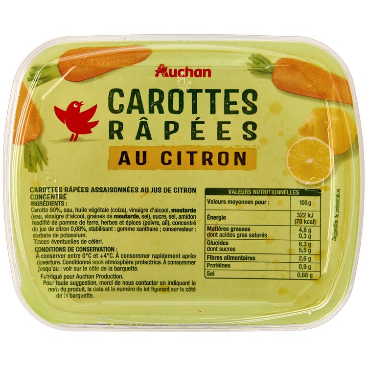 Ingrédients : Carotte 80%, eau, huile végétale (colza), vinaigre d'alcool, moutarde (eau, vinaigre d'alcool, graines de moutarde, sel), sucre, sel, amidon modifié de pomme de terre, herbes et épices (poivre, ail), concentré de jus de citron 0,08%, stabilisant: gomme xanthane conservateur: sorbate de potassium. Traces éventuelles de céléri.