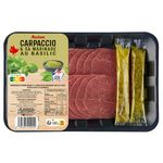 Ingrédients : 82% viande bovine (Origine : France) -morceaux à carpaccio, 18% marinade (huile de colza, 4.3%* basilic, huile d'olive, eau, sel, jus de citron concentré, ail, poivre blanc)