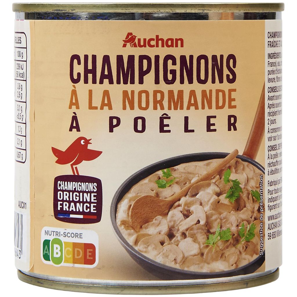 Ingrédients : Champignons de Paris 56%, eau, crème fraîche (LAIT) 13%, cidre 11%, purée d'échalotes, amidon de maïs, sel, extrait de levure, fibres de lin, arôme naturel de citron.