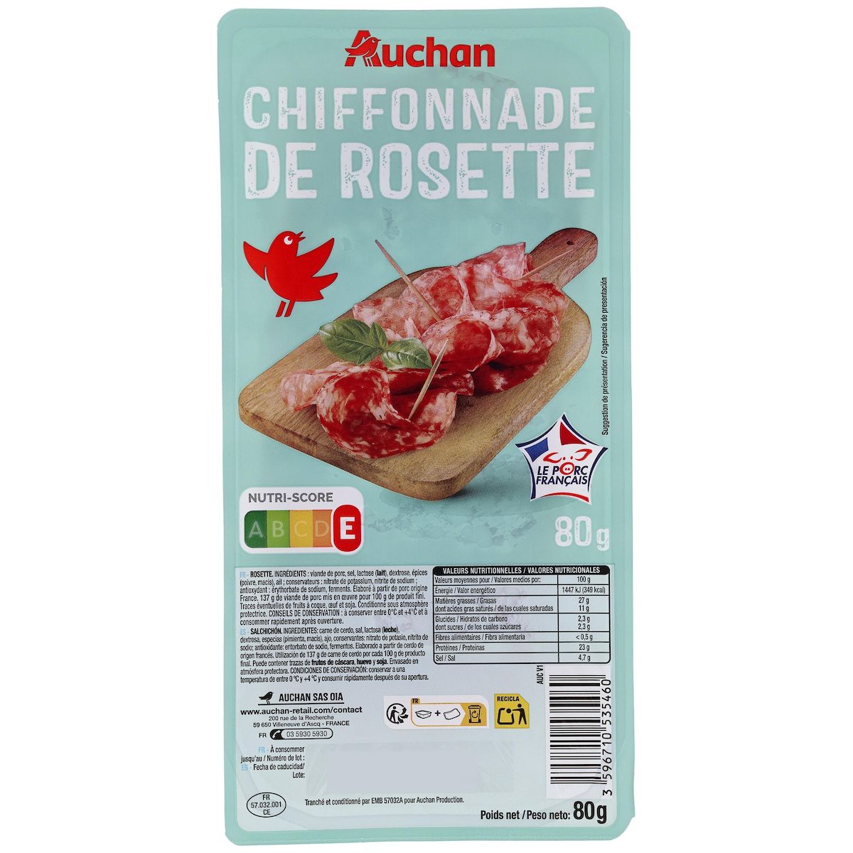 Ingrédients : Viande de porc, sel, lactose (LAIT), dextrose, épices (poivre, macis), ail conservateurs : nitrate de potassium, nitrite de sodium antioxydant : érythorbate de sodium, ferments.Elaboré à partir de porc origine France.137g de viande de porc mis en œuvre pour 100g de produit fini.Traces éventuelles de fruits à coque, œuf et soja.