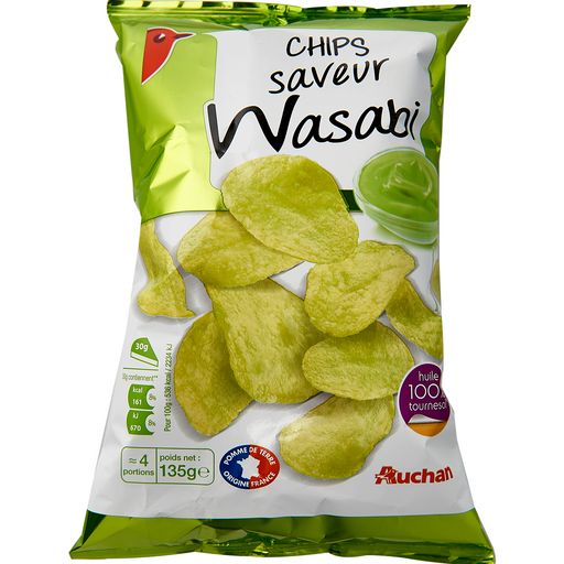 Pommes de terre 59,9% (origine France), huile de tournesol 34%, base aromatisante wasabi [arômes (contient blé ), correcteur d'acidité: diacétate de sodium; acidifiant: acide citrique; colorant: complexes cuivriques des chlorophylles; oignon en poudre, extrait de poivre noir], sel. Traces éventuelles de lait, moutarde et céleri.