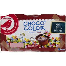 Ingrédients : Crème dessert au chocolat 87,5% : LAIT partiellement écrémé 70%, sucre 9,1%, amidon modifié de maïs, cacao maigre 1,9%, chocolat 1,75% (sucre, pâte de cacao, beurre de cacao), poudre de LAIT écrémé, épaississant : carraghénanes. Dragées au chocolat au lait enrobé de sucre coloré 12,5% : Chocolat au lait 7,5% (sucre, pâte de cacao, beurre de cacao, LAIT entier en poudre émulsifiant : lécithines) enrobage (sucre, amidon, agents d'enrobage : gomme d'acacia, cire de carnauba, cire d'abeille blanche et jaune, jus concentré de raisin, concentré d’algues, concentré de carthame, extrait de malt d’ORGE, colorants : curcumine, caroténoïdes, rouge de betterave). Traces éventuelles de soja, de fruits à coque et d'autres céréales contenant du gluten. Crème dessert élaborée à partir de lait origine France. Le lait contenu dans les dragées ne provient pas de France.