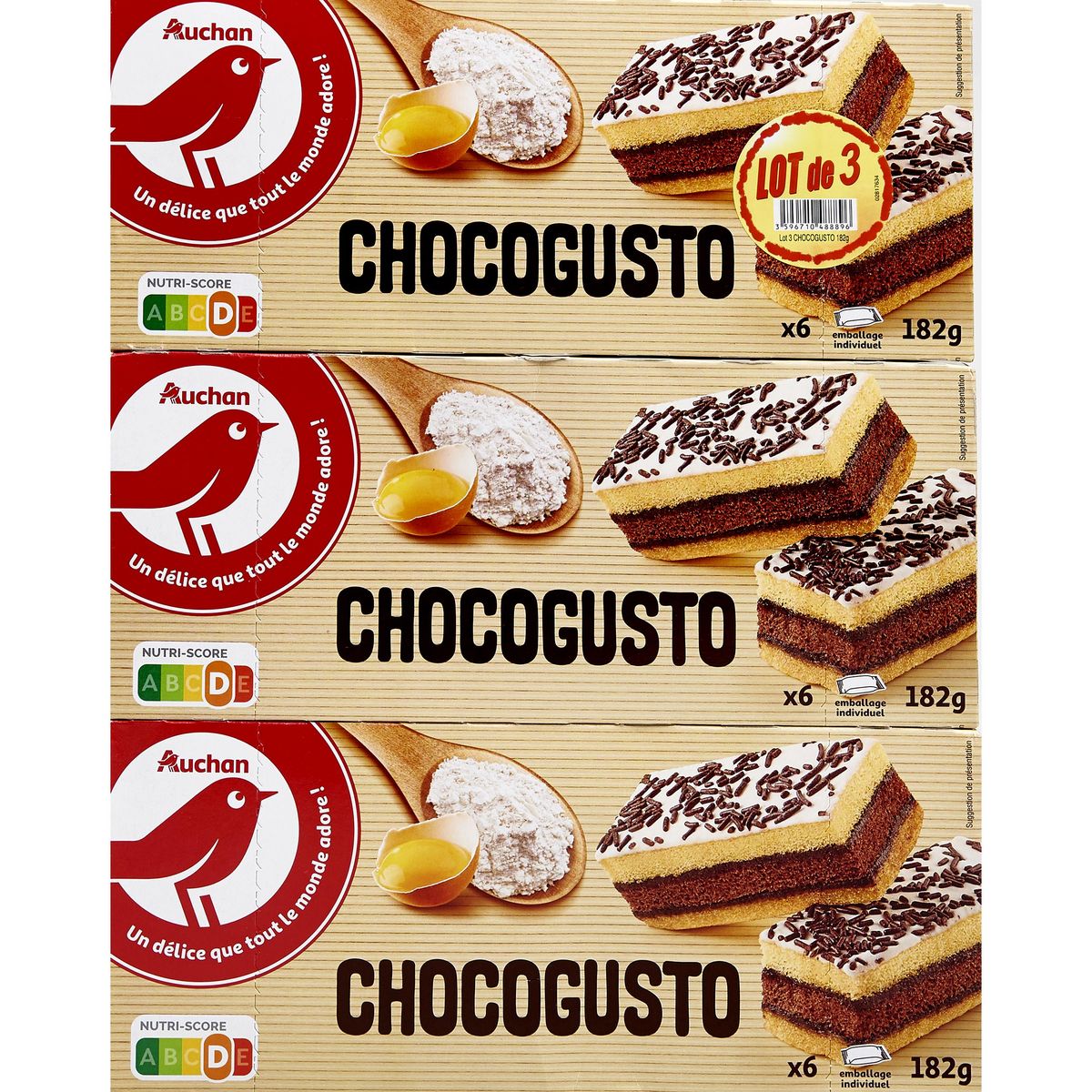 Ingrédients : Sucre (contient BLÉ), farine de BLÉ 20%, sirop de glucose, OEUFS entiers 7,6%, graisses végétales (palme, palmiste), cacao maigre en poudre 3,4%, fécule de pomme de terre, vermicelles de chocolat 2,9%(sucre, pâte de cacao, cacao maigre en poudre, dextrose, émulsifiant :lécithines, agent de glaçage : shellac, gomme d'acacia), humectant :glycérol, stabilisant : sorbitols, LAIT entier en poudre, jaune d'OEUFS en poudre, dextrose, arômes naturels (contient de l'alcool), amidon de riz poudres à lever : diphosphates, carbonates de sodium, carbonates d'ammonium émulsifiant : mono- et diglycérides d'acides gras, beurre de cacao, maltodextrine, colorant : caroténoïdes. Traces éventuelles de soja, de fruits à coque et de moutarde.