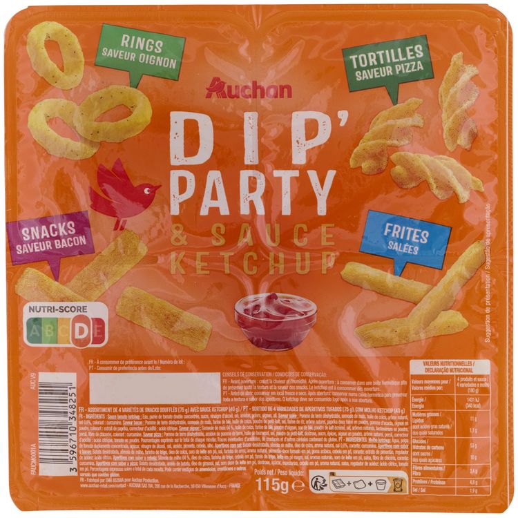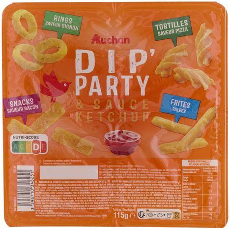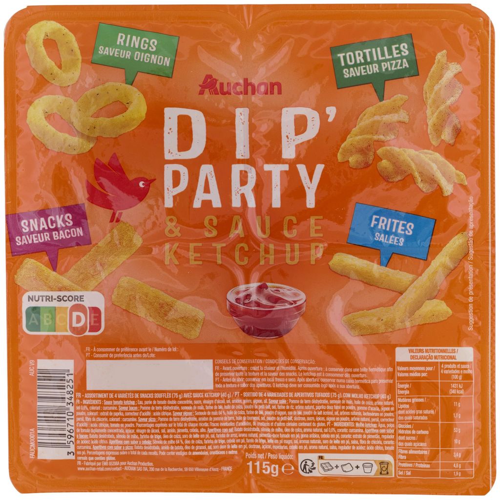 Ingrédients : saveur salée : Pomme de terre déshydratée, semoule de maïs, huile de colza, arôme naturel, sel 0,6%, colorant : curcumine. saveur bacon : Pomme de terre déshydratée, semoule de maïs, farine de blé, huile de colza, poudre depetit-lait, sel, farine de riz, arôme naturel, paprika douxfumé en poudre, gomme d'acacia, oignon en poudre, colorant : extrait de paprika,correcteur d’acidité : acide citrique. saveur oignon :Semoule de maïs 64%, huile de colza, farine de blé, poudre d’oignon, son de blé, poudre de lait écrémé, sel, arômes naturels, lactosérumen poudre, persil, fibre de chicorée, colorant : curcumine.saveur pizza : Pomme de terre déshydratée, amidon de pomme de terre, huile de tournesol, sel, poudre de petit-lait, dextrose, sucre, épices, oignon en poudre, arôme naturel, persil, correcteurd’acidité : acide citrique, tomate en poudre.Sauce tomato ketchup : Eau, purée de tomate double concentrée, sucre, vinaigre d'alcool, sel, amidon, poivre, oignon, ail.Pourcentages exprimés sur le total de chaque recette.Traces éventuelles d’arachides, de crustacés et d'autres céréales contenant du gluten.