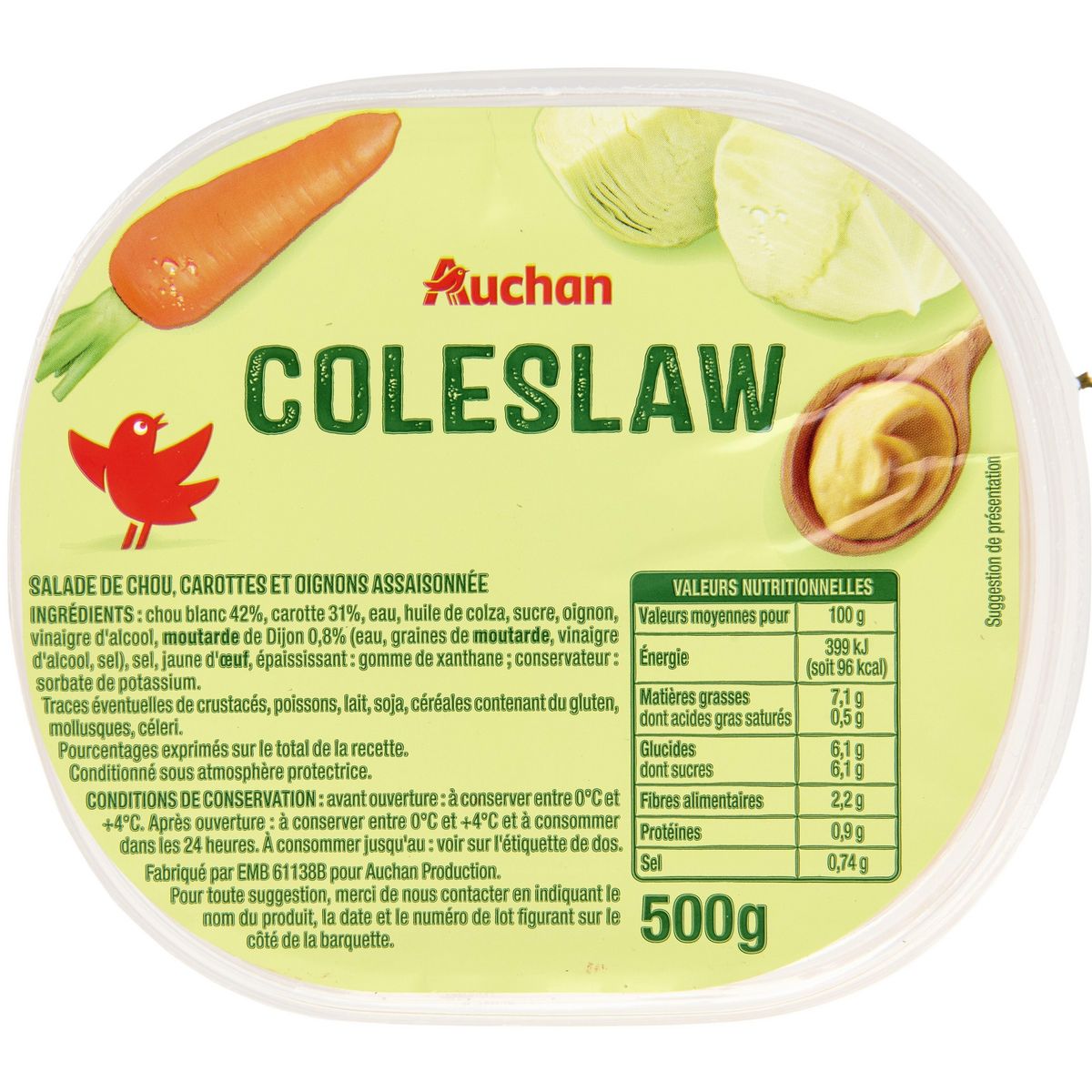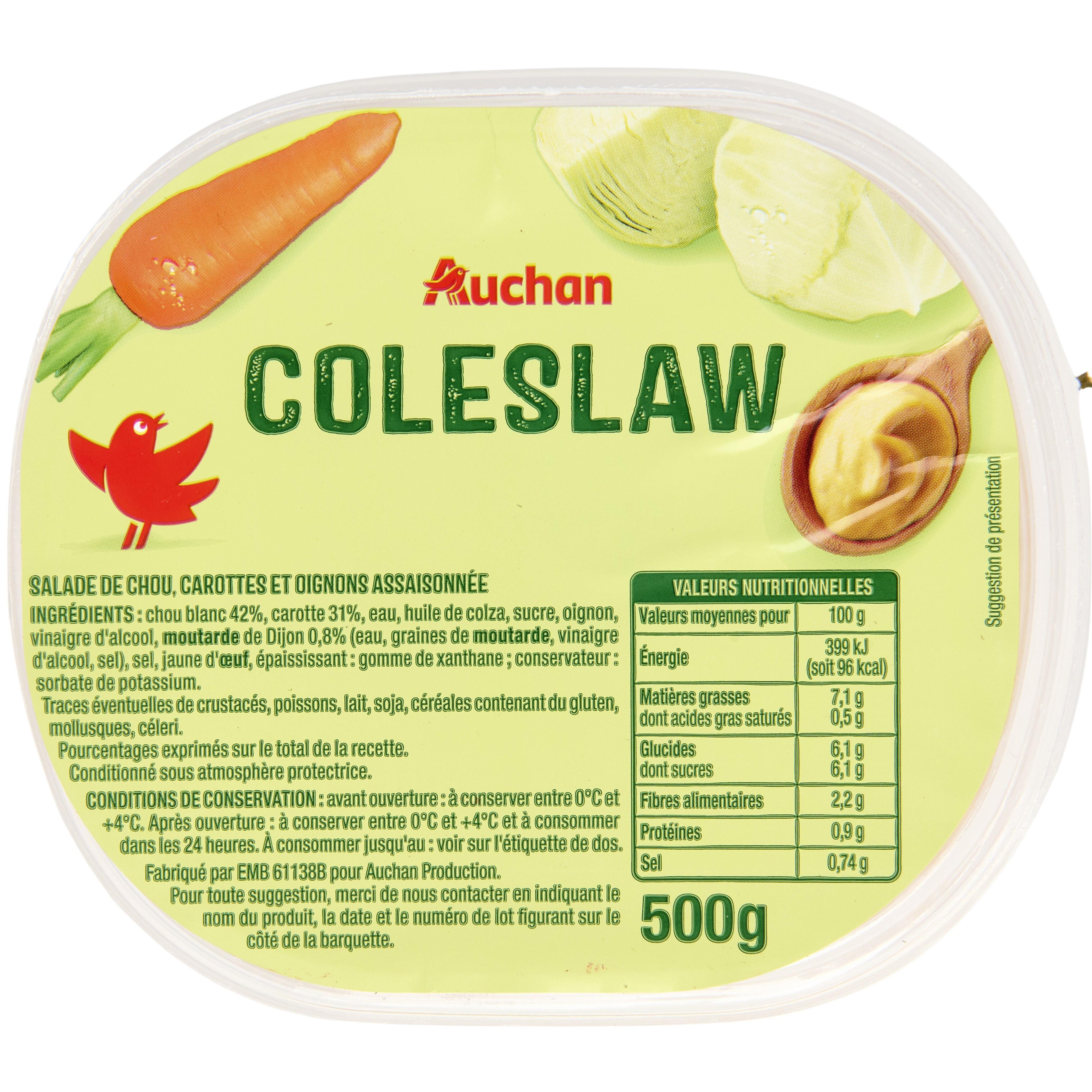 Ingrédients : Chou blanc 42%, carotte 31%, eau, huile de colza, sucre, oignon, vinaigre d'alcool, MOUTARDE de Dijon 0,8% (eau, graines de MOUTARDE, vinaigre d'alcool, sel), sel, jaune d'OEUF, épaississant : gomme de xanthane conservateur : sorbate de potassium. Traces éventuelles de crustacés, poissons, lait, soja, céréales contenant du gluten, mollusques, céleri. Pourcentages exprimés sur le total de la recette.