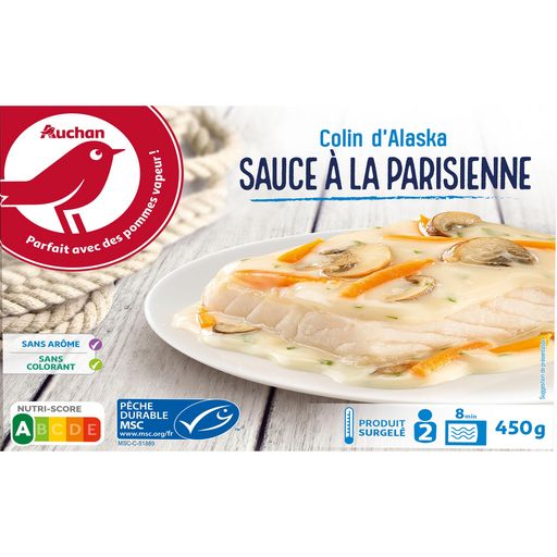 Ingrédients : Portions de bloc de filets de colin d'Alaska MSC** (POISSON) (Theragra chalcogramma) 50%, eau, champignons 8,8%, crème fraîche 8% (LAIT origine UE), carottes 4,8%, amidon modifié de maïs, vin blanc, farine de BLÉ, LAIT écrémé en poudre, sel, jus de citron (eau, jus de citron concentré), échalotes, huile végétale de colza, vinaigre d'alcool, persil. Traces éventuelles de céleri, mollusques, crustacés, œuf, soja, moutarde et graines de sésame. Pourcentages exprimés sur le total de la recette. (*)Malgré tout le soin apporté à la préparation de nos produits, la présence exceptionnelle d'arêtes n’estjamais exclue. (**)Ce produit provient d’une pêcherie qui a répondu au référentiel environnemental du Marine Stewardship Council pour une pêche durable et bien gérée.www.msc.org/fr