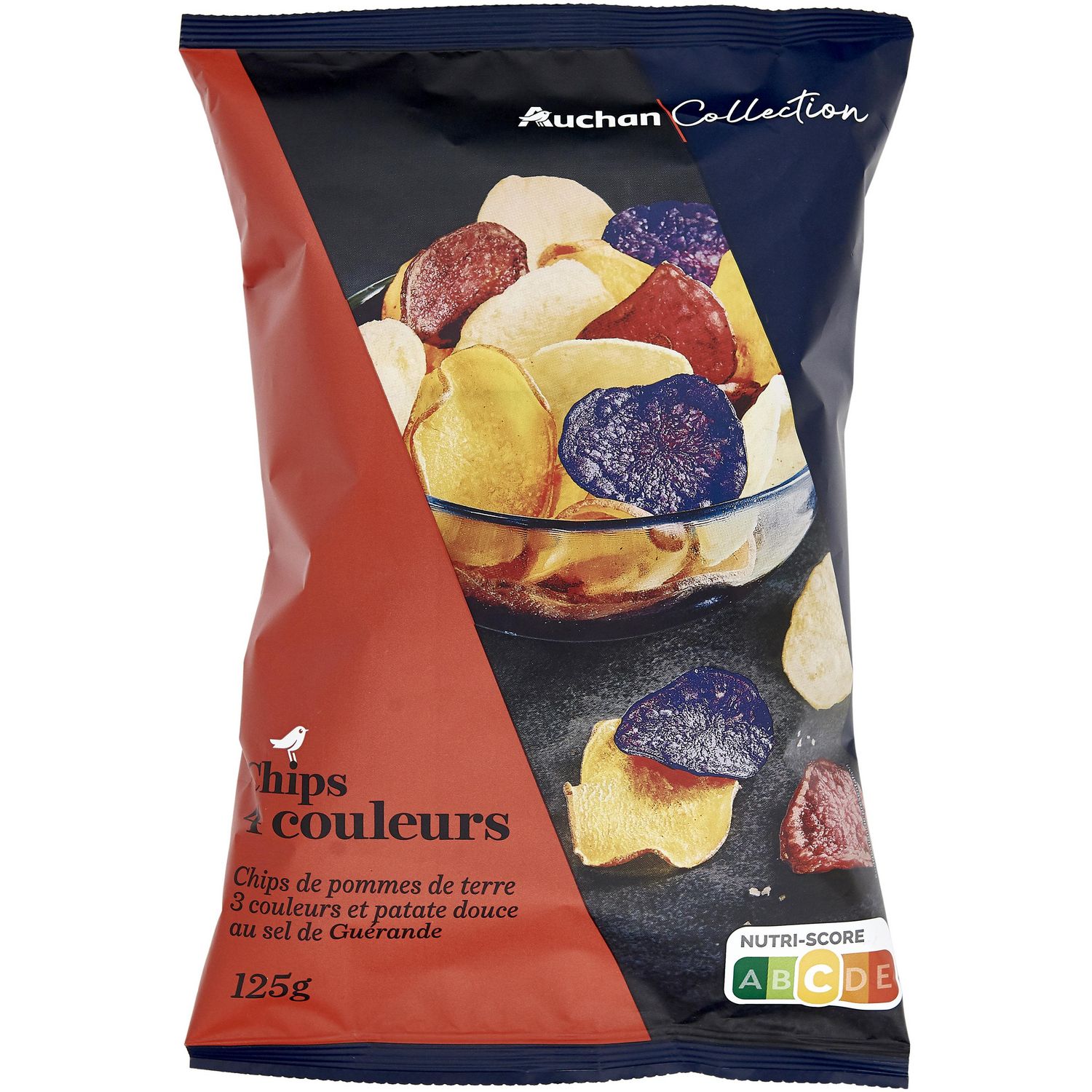 Ingrédients : Mélange de pommes de terre 3 couleurs en proportions variables (pommes de terre à chair jaune, pommes de terre à chair rouge, pommes de terre à chair bleue) 61.4%, patate douce 20.5%, huile de tournesol, sel de Guérande 1.1%. Traces éventuelles de lait. Conditionné sous atmosphère protectrice