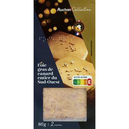 2 tranches de foie gras de canard entier isssues de canards élévés dans le sud ouest de la france, preparé avec une recette a l'Armagnac. Un foie gras premium, idéal pour une entrée a deux!