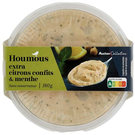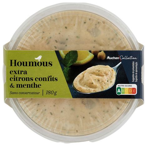 Ingrédients : Pois chiche 54%, huile de colza, pâte de graines de SÉSAME 11%, eau, écorce de citron confit 3,4% (écorce de citron, sirop de glucose-fructose, sucre, correcteur d'acidité : acide citrique), jus de citron concentré, huile d'olive vierge extra, menthe 0,99%, sel. Traces éventuelles de crustacés, lait, mollusques, moutarde, poisson, céleri, oeufs, soja et blé.