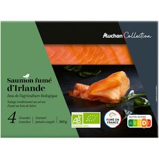 Saumon Atlantique (salmo salar), élevé en Irlande, fumé au bois de hêtre, issu de l'agriculture biologiqueFabrication certifiée par Bureau Veritas certification France FR-BIO-10Distribution certifiée par Ecocert France FR-BIO-01
