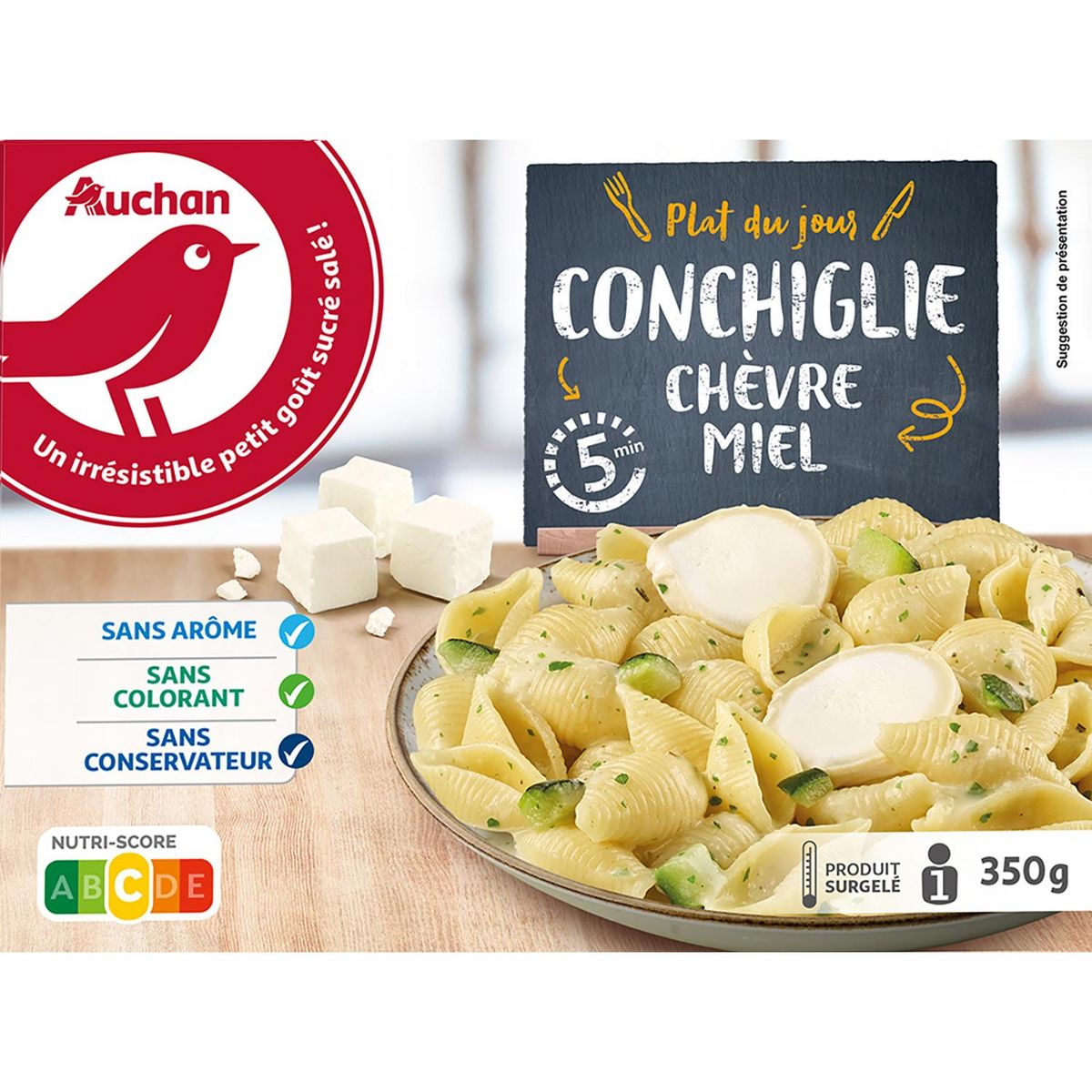 Ingrédients : Pâtes cuites 50,3% (eau, semoule de BLÉ dur, huiles végétales (huile de tournesol et/ou huile de colza), sel), fromage de chèvre (LAIT) 9,8% , crème (LAIT), LAIT demi-écrémé, eau, oignon, courgette, oignon grillé, miel 1,7%, huiles végétales (contient tournesol et/ou colza), fécule de manioc, sel, persil, ail, protéine de LAIT, romarin, thym, poivre blanc. Elaboré à partir de lait origine UE Traces éventuelles de moutarde