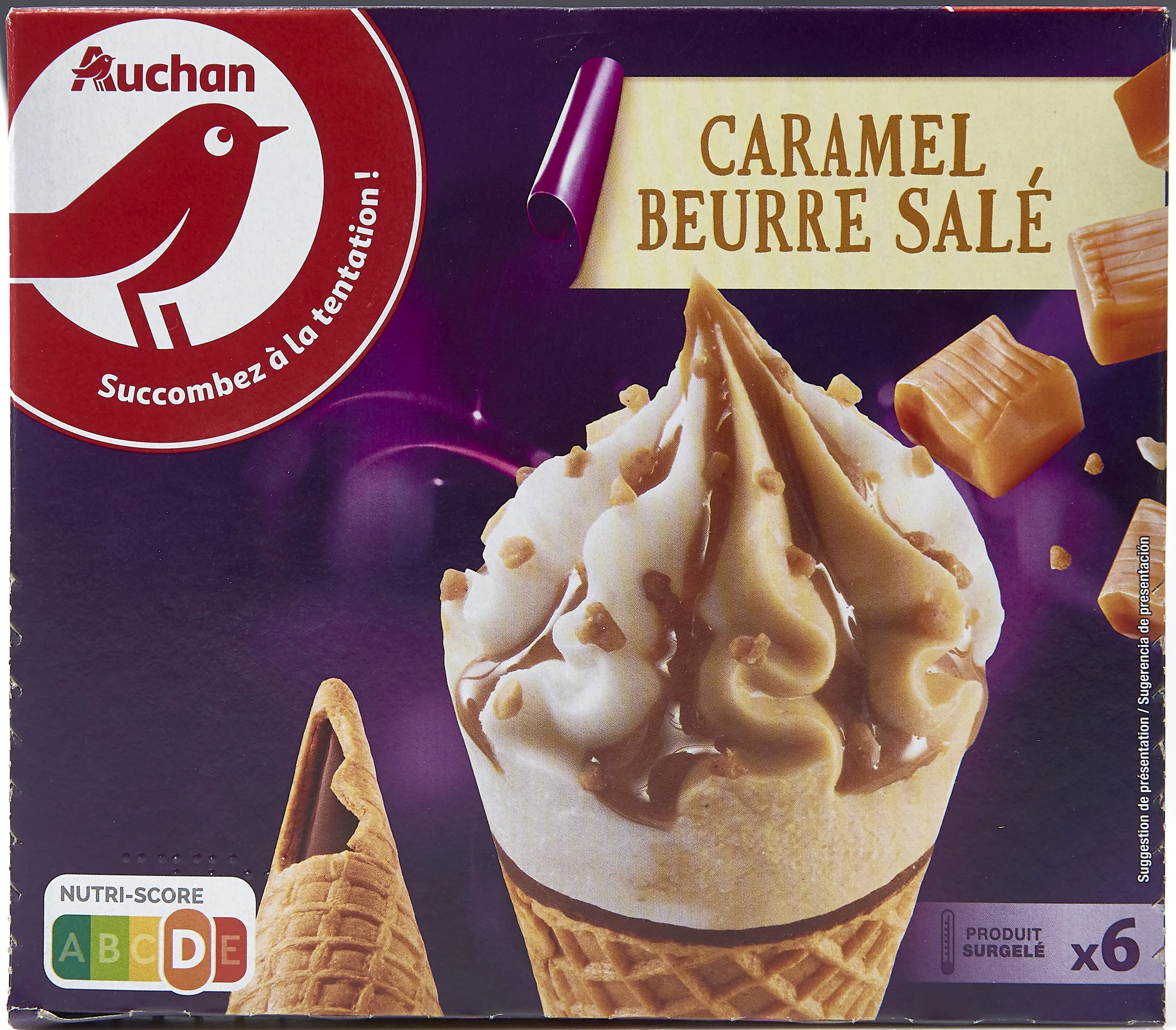 Cône de glace au caramel beurre salé, aromatisée 35.2% (dont 1.7% de caramel au beurre salé), glace à la vanille 35.2%, gaufrette 16,2%, chemisage au cacao maigre 7,8%, décor sauce caramel au beurre salé 4.2% (dont 0,5% de caramel au beurre salé) et morceaux de noisettes caramélisées 1.4%, surgelé.