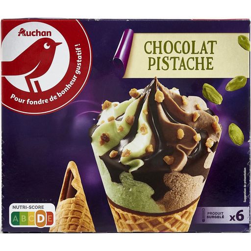 Cône de glace au chocolat 34,9% et de glace à la pistache 34,9%, gaufrette 17,4%, chemisage et décor au cacao maigre 10,6%, morceaux de noisettes caramélisés 2,2% en décor, surgelé