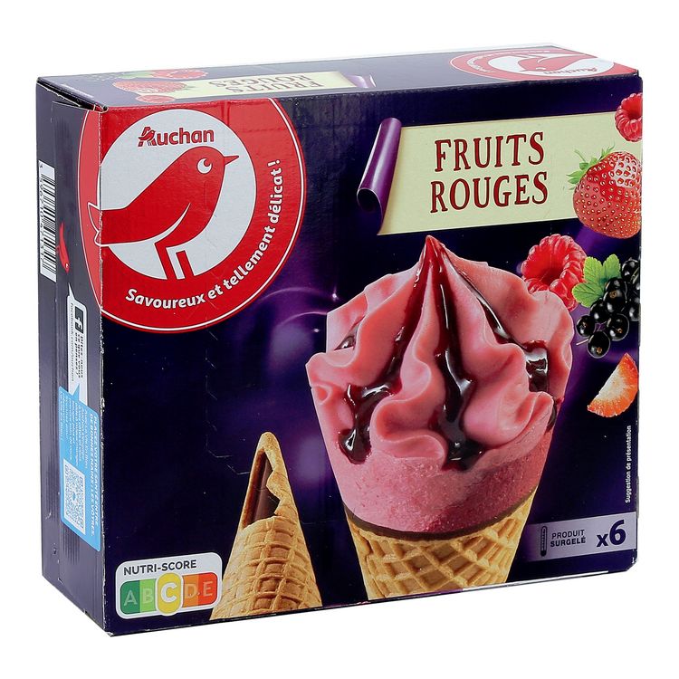 Sorbet fraise framboise (50,1%) et sorbet cassis (26%), gaufrette (13,4%), pâte à glacer au cacao maigre (6,3%), sauce aux fruits rouges, aromatisée (4,2%), surgelés.