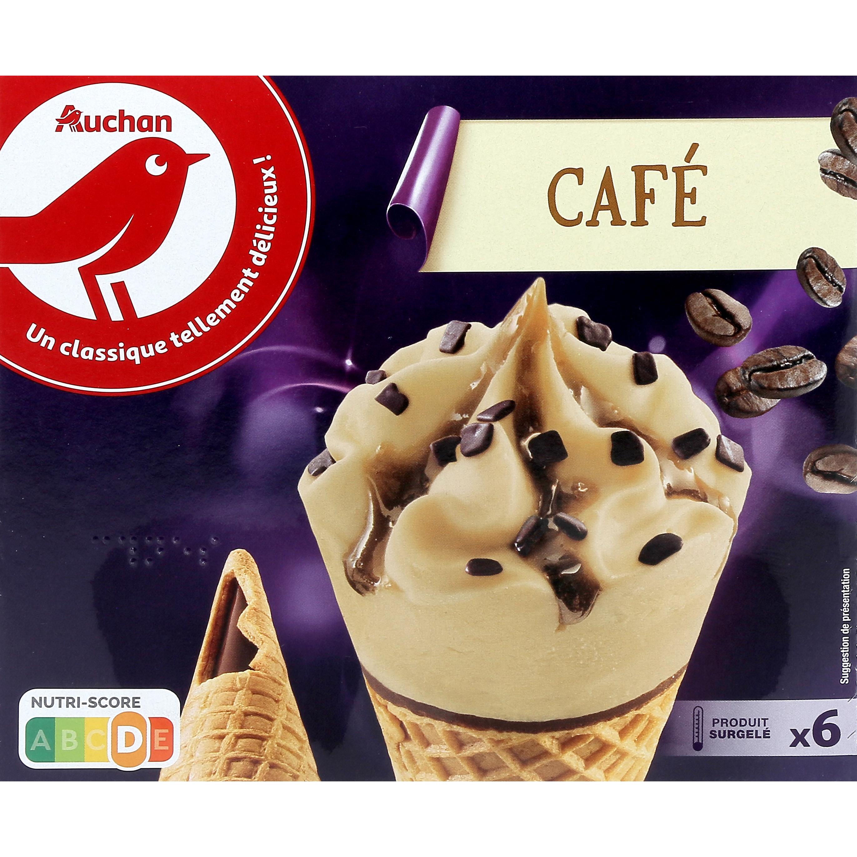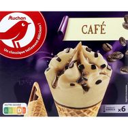 Cône de glace au café 71,2%, gaufrette 16,6%, chemisage au cacao maigre 7,9%, sauce au chocolat et au café 2,9% et pépites de chocolat 1,4% en décor, surgelé