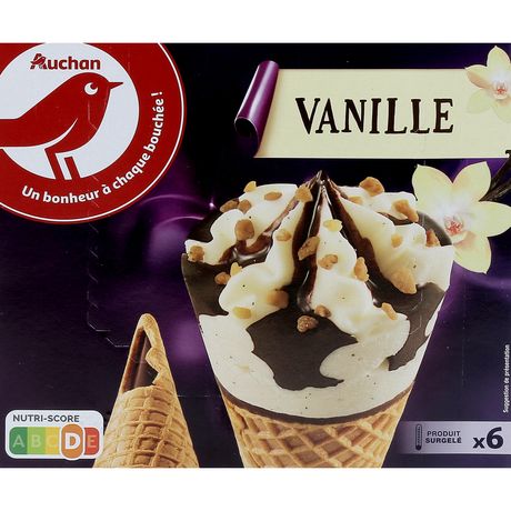 Glace vanille (72,9%), gaufrette (13,9%), pâte à glacer au cacao maigre (11%), nougatine (2,2%), surgelée.