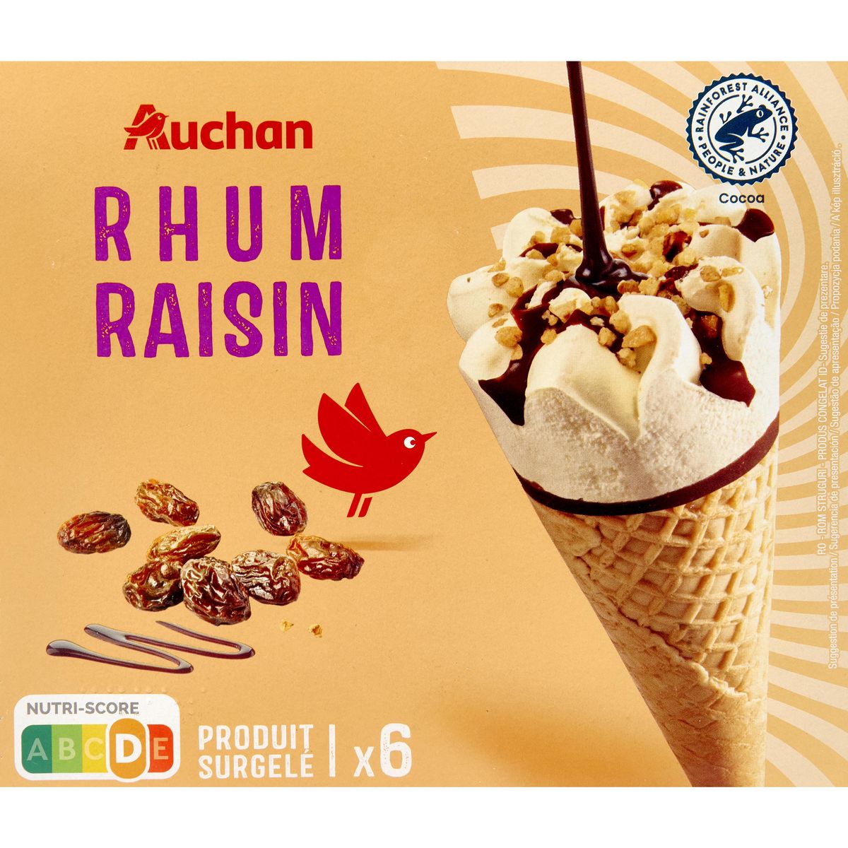 Cône de glace à la vanille 34,7% et de glace au rhum 33% avec une préparation de raisins de Corinthe au rhum 3,6% en inclusion, gaufrette 16,5%, chemisage au cacao maigre 7,9%, décor de sauce chocolat 2,9% et morceaux de noisettes caramélisés 1,4%.