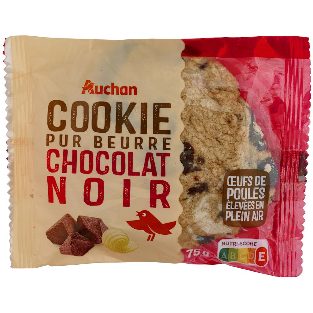 Ingrédients : Farine de BLÉ, beurre 21% (LAIT origine France), pépites de chocolat noir 21% (pâte de cacao 11%, sucre, beurre de cacao 2,8%, émulsifiant : lécithines arôme naturel de vanille), sucre, ŒUFS de poules élevées en plein air 5,1%, amidon de maïs, sucre roux, poudre d'AMANDE blanchie, sel de Guérande IGP. Traces éventuelles de soja, d'arachides et d’autres fruits à coque.