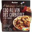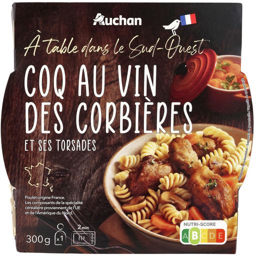 Ingrédients : Morceau de cuisse de poulet précuit 26%, eau, spécialités céréalières précuites 16% (eau, semoule de BLÉ dur de qualité supérieure, poudre de blanc d'OEUF), vin rouge des Corbières AOC 13% (contient des SULFITES ), carottes 6%, champignons de Paris 6%, oignons 4%, purée de tomates double concentrée, amidon modifié de maïs, sel, farine de BLÉ , huile de colza, ail, poivre, laurier, thym. Pourcentages exprimés sur le total de la recette. Elaborée à partir de poulet origine France. Peut contenir des traces de soja et de moutarde.