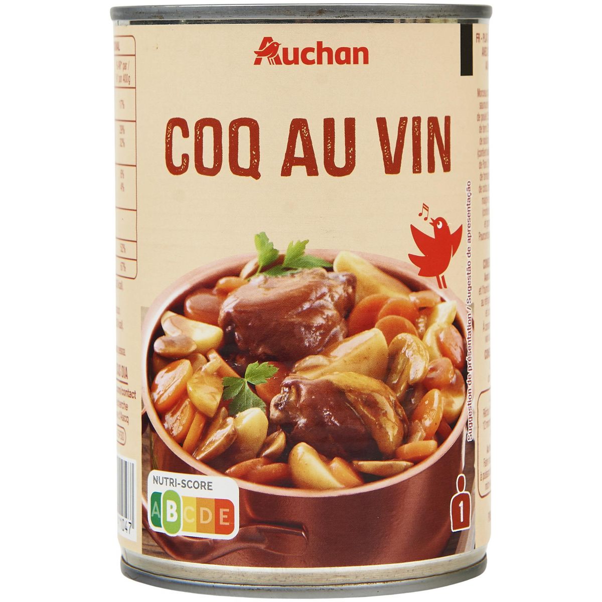 Ingrédients : Morceaux de cuisses de poulet non-désossés saumurés et précuits (morceaux de cuisse de poulet 35% (origine UE), eau, sel), pommes de terre 23% (dont conservateur : DISULFITE de sodium), eau, vin rouge Corbières 7,5% (contient SULFITES), carottes 6%, champignons de Paris 2%, oignons 2%, double concentré de tomates, amidon modifié de maïs, huile de colza, colorant : caramel ordinaire, cacao maigre en poudre, sel, arômes naturels (contient LAIT), gélifiants : gomme guar et gomme xanthane, sucre, poivre. Pourcentages exprimés par rapport au poids net total.