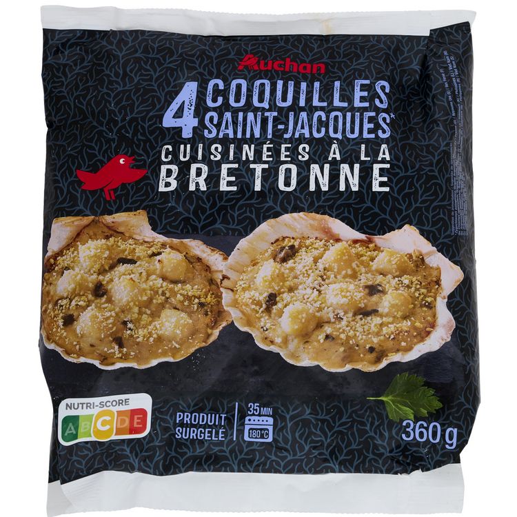 4 coquilles Saint-Jacques* cuisinées à la bretonne surgeléesOrigines : *Zygochlamys patagonica, origine Argentine (A)Ou Chlamys opercularis, Origine Ecosse (B) /Irlande (C) /France (D) /Royaume Uni (E) /Iles Féroé (F)Ou Argopecten purpuratus, Origine Pérou (G) Ou Argopecten irradians, origine USA (H) /Corée (I) /Thaïlande (J) /Indonésie (K) /Philippines (L) / Viet Nam (M)Ou Chlamys nobilis, origine USA (N) /Corée (O) /Thaïlande (P) /Indonésie (Q) /Philippines (R) / Viet Nam (S)origine, voir la