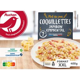 Ingrédients : Pâtes coquillettes cuites 51% (eau, semoule de BLÉ dur, sel, huile de tournesol), eau, jambon supérieur cuit 12% (jambon de porc (origine France), sel, bouillon de porc (viande de porc et os de porc), arômes naturels (contiennent naturellement des polyphénols), antioxydant : ascorbate de sodium), crème (LAIT) 9%, emmental (LAIT) 6.8%, farine de riz, LAIT entier en poudre, farine de BLÉ, poivre blanc, muscade moulue. Traces éventuelles de moutarde.