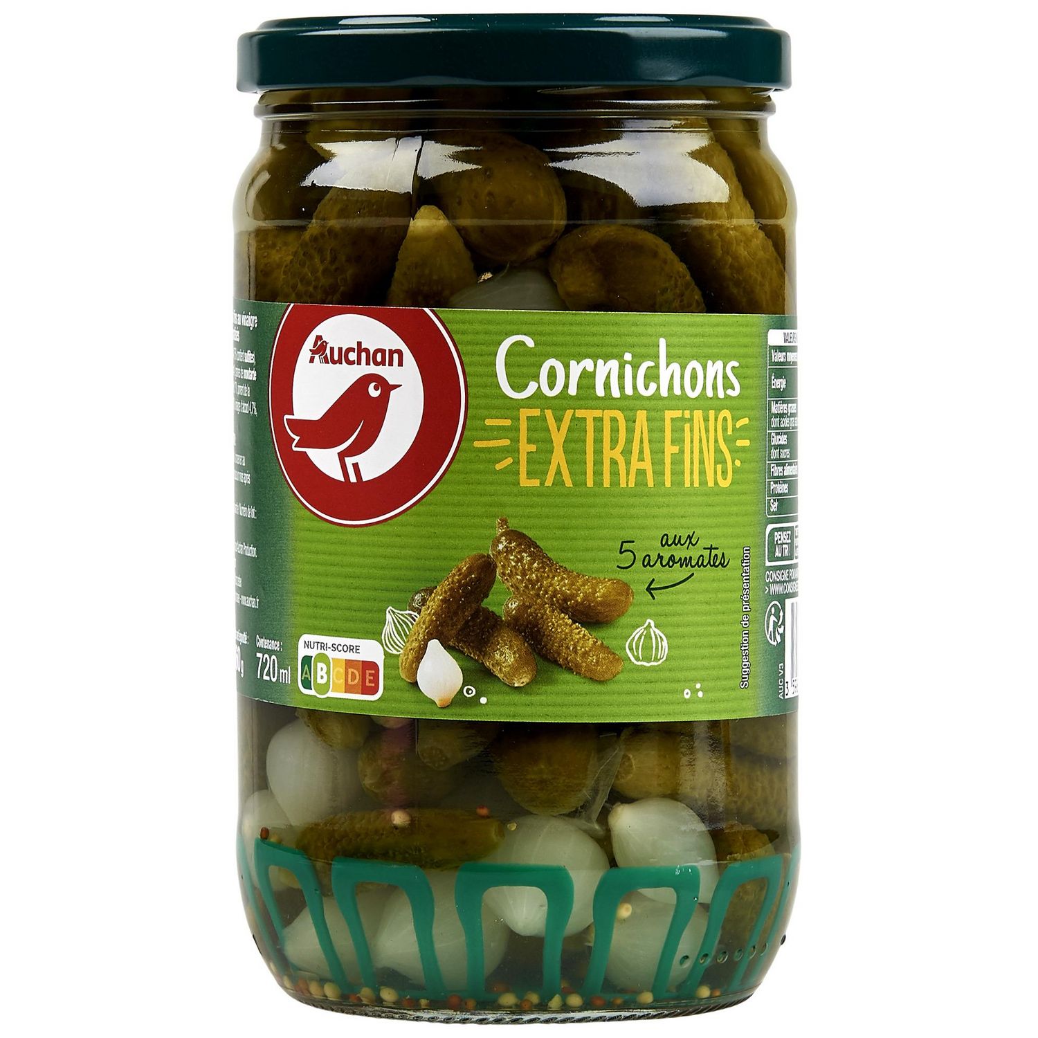 Ingrédients : Cornichons 47,5% (contient SULFITES), eau, aromates 5% (oignons 4%, graines de MOUTARDE 0.66%, graines de coriandre 0.17%, piment de la Jamaïque 0.1%, poivre 0.07%), vinaigre d'alcool 4.7%, sel, arôme naturel.