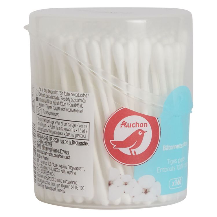 Pratique et hygiénique, la boîte en plastique protège les bâtonnets coton AUCHAN et assure un excellent confort à l'utilisation.