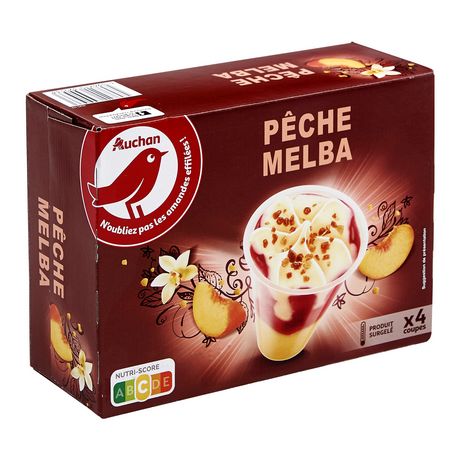 Sorbet pêche (44,1%), glace vanille (41,4%), sauce à la griotte, aromatisée (8,3%), préparation de morceaux de pêche (4,9%), nougatine (1,4%), surgelés.