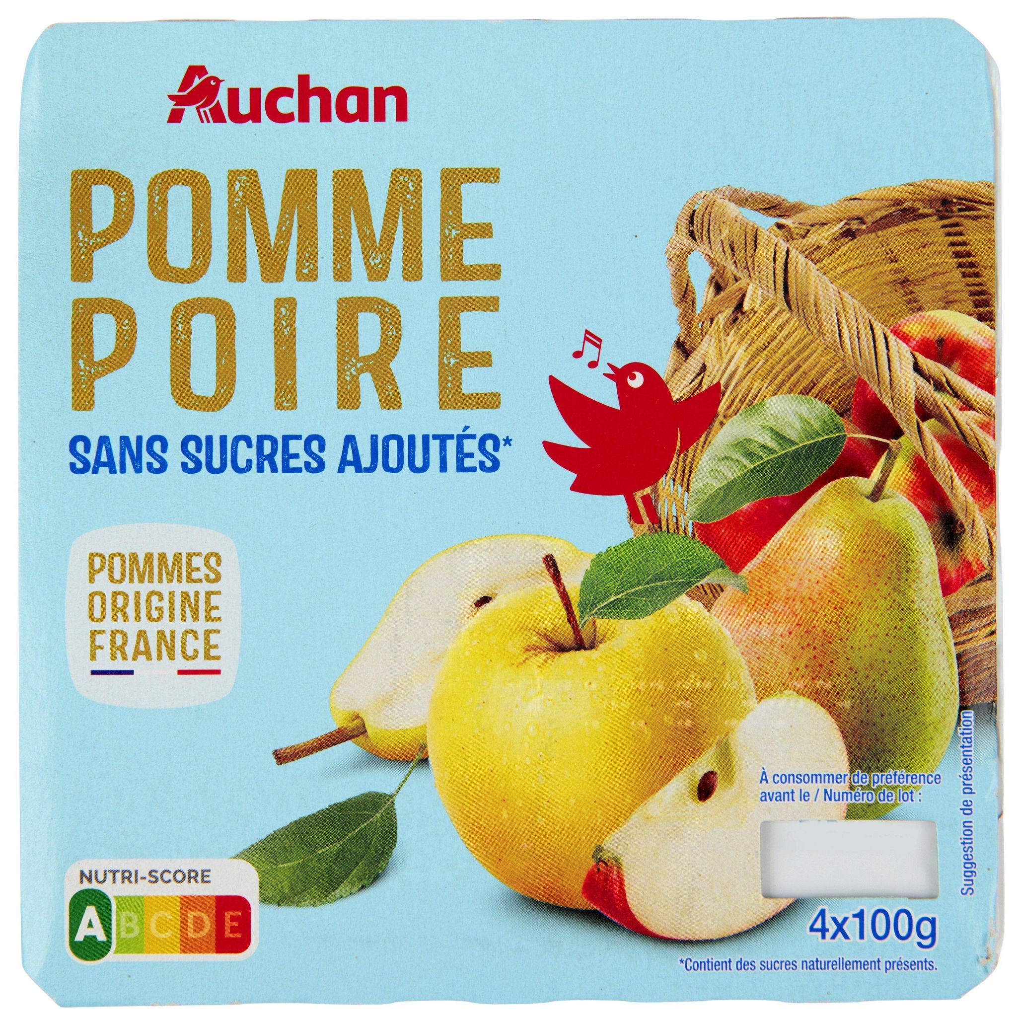 Ingrédients : Purée de pommes 59,3% (origine France), purée de poires 40% (origine Espagne, France et/ou Italie), arôme naturel de poire, antioxydant : acide ascorbique.