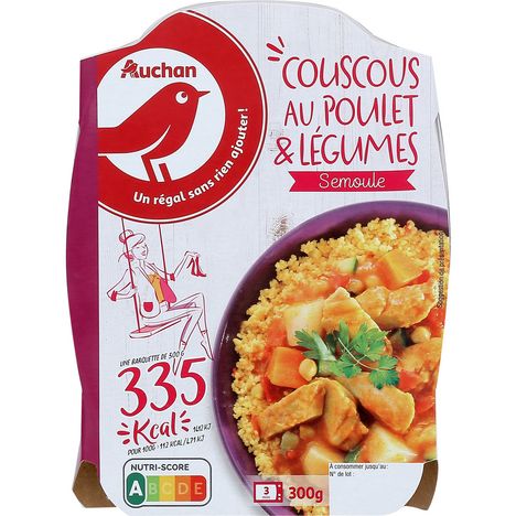 Ingrédients : Viande de poulet rôtie cuite traitée en salaison 30% (viande de poulet 25,5%, eau, saumure (amidon de manioc, sel, dextrose), sirop de sucre caramélisé), semoule de BLÉ dur réhydratée 24,7% (semoule de BLÉ dur, eau, huile de tournesol, sel, curcuma), eau, carottes 5,3%, poivrons rouges 5,3%, courgettes 4,7%, navets 4,3%, concentré de tomates, pois chiches 2,2%, oignons 1,8%, bouillon de légumes (légumes et jus de cuisson de légumes (carotte, poireau, oignon, ail), extrait de vin blanc (contient SULFITES), sel, huile de tournesol, extraits d'épices), amidon modifié de maïs, ail, sel, épices harissa (piment, ail, coriandre, sel, carvi), cumin, coriandre 0,04%, paprika, curcuma, piment de Cayenne. Pourcentages exprimés sur le total de la recette. Elaboré à partir de poulet origine France. Traces éventuelles de lait et soja.