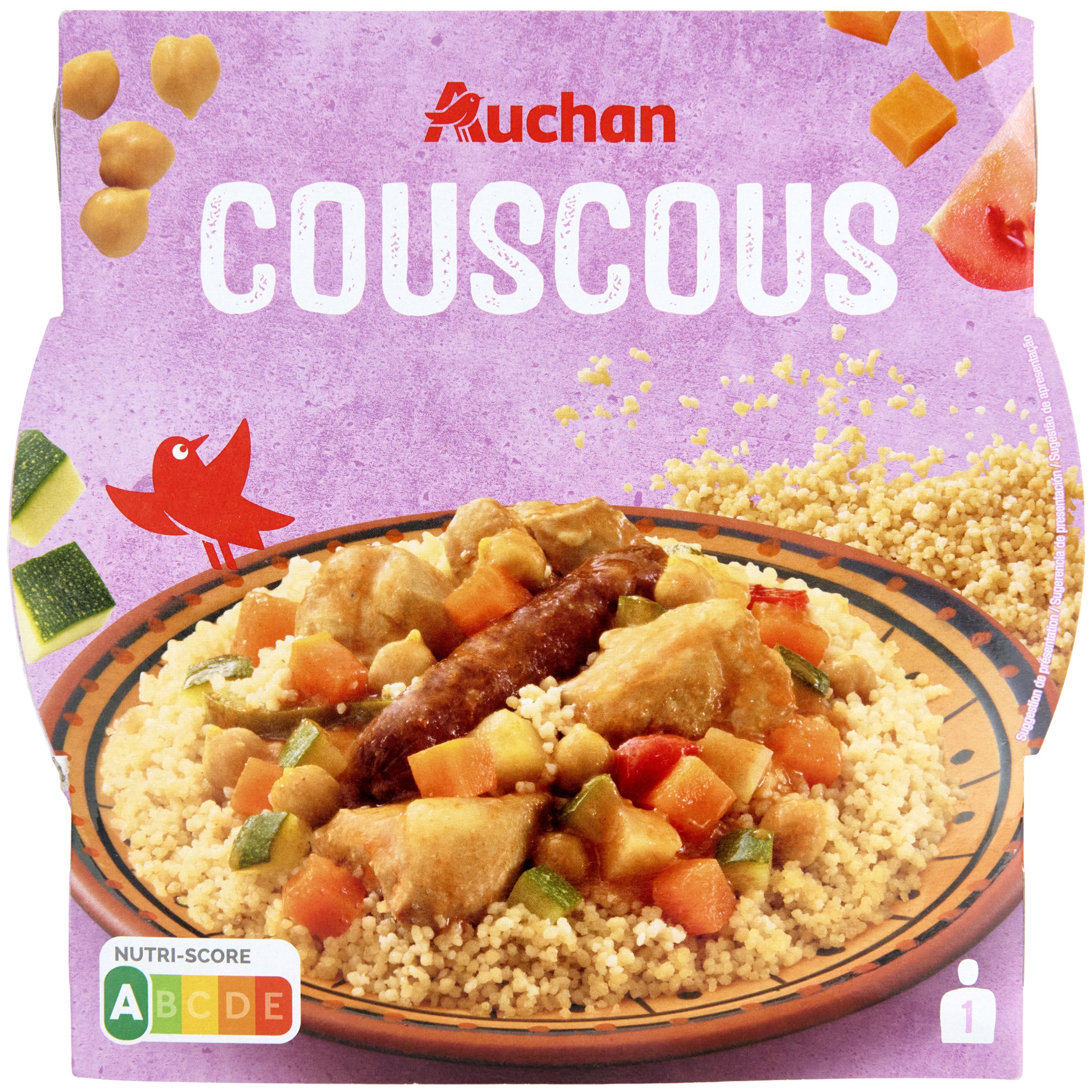 Ingrédients : Semoule de couscous réhydratée (eau, semoule de blé dur, huile de colza, sel) 33%, viande de poulet vapeur (cuisse de poulet, eau, manioc, sel) 18%, eau, merguez (viande de bœuf 84%, gras de mouton, viande de mouton 4%, épices, plantes aromatiques, sel, dextrose, arômes naturels) 6%, carotte 5%, courgette 5%, pois chiche 4%, concentré de tomate, oignon, poivron rouge, poivron vert, navet, farine de blé, sel, coriandre, cumin, curcuma, piment fort.Elaboré à partir de viande de bœuf, de poulet et de mouton origine UE.Pourcentages exprimés sur le total de la recette.Traces éventuelles d'œufs, de poisson, de lait et de moutarde.
