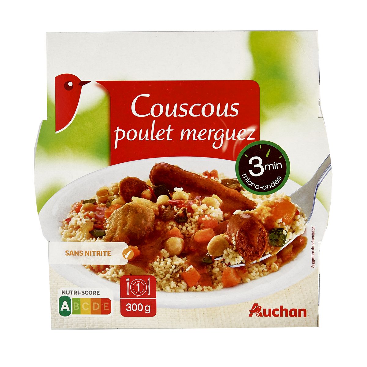 Ingrédients : Semoule de BLÉ dur préparée 31%, (eau, semoule de BLÉ dur, huile de tournesol, sel), viande de poulet saumurée précuite 20% (viande de poulet (origine : UE) 20.5%, eau, sel), eau, carottes 8%, merguez cuite 7% (viande bovine (origine : UE), eau, viande de mouton (origine : UE ou hors UE), épices et plantes aromatiques, sel, plasma de bœuf, colorant : extrait de paprika, arôme naturel de poivre, arôme naturel de girofle, antioxydant : acide ascorbique, arôme naturel d'ail, arôme naturel de muscade), navets 5.5%, courgettes 5.5%, poivrons rouges 3.5%, pois chiches trempés et précuits 3%, double concentré de tomates, huile de tournesol, épices et plantes aromatiques, amidon de manioc, amidon modifié de maïs, sel, colorant : extrait de paprika, arôme naturel de girofle. Traces éventuelles de lait.