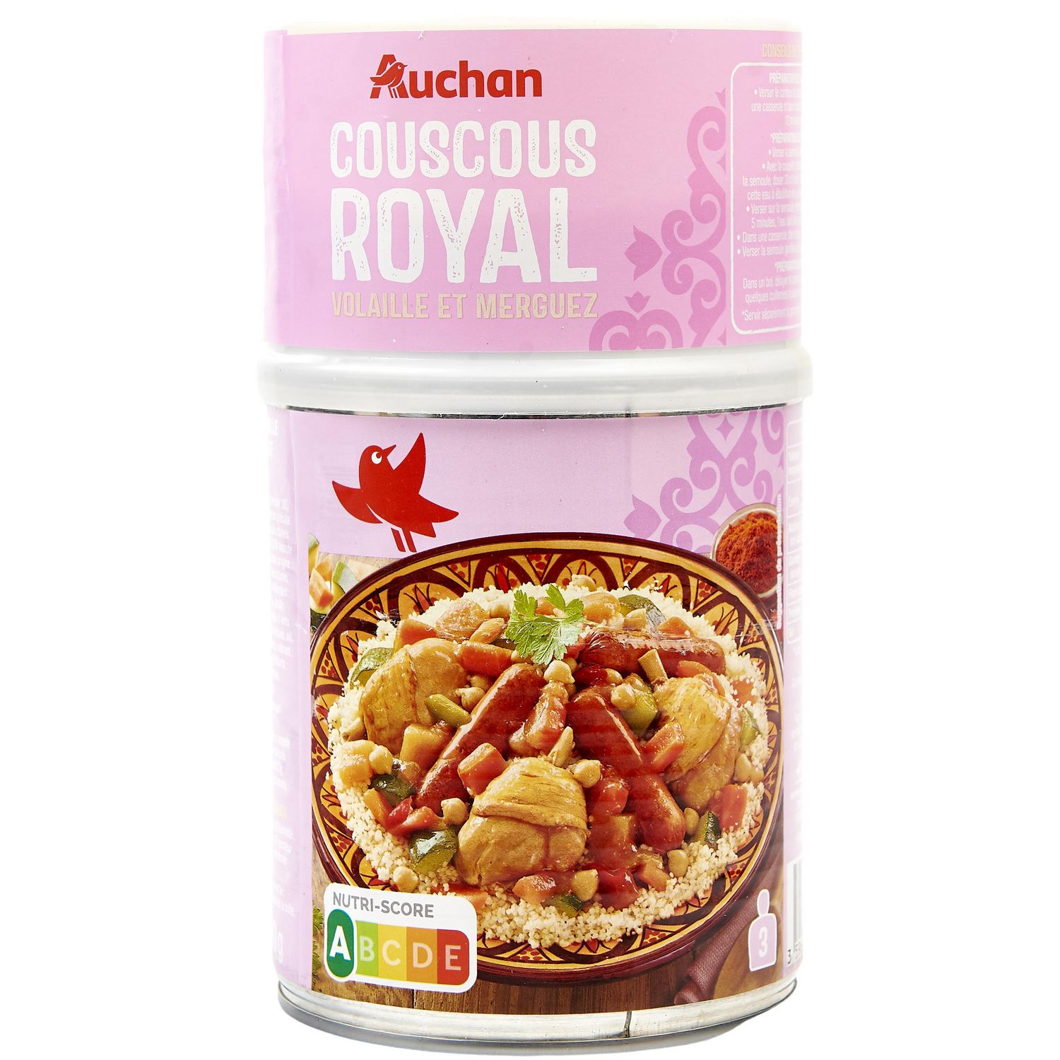 Ingrédients : Eau, morceaux de cuisse de poulet (origine : UE) nondésossées 21%, semoule de BLÉ dur précuite 18%, carottes 7,5%, navets 4,5%,pois chiches trempés précuits 4%, merguez cuite 3,6% (viande de dinde (origine : UE),viande de mouton (origine : UE / non UE), eau, épices, sel, arômes naturels, sirop de glucose,plasma de bœuf, antioxydant : acide ascorbique), courgettes 3%, double concentré de tomates, poivrons rougeset verts 1,8%, oignons, épices et plantes aromatiques, sel, arômes naturels(contient CÉLERI), sucre, colorant: extrait de paprika, huile decolza, gélifiants: gomme guar et gomme xanthane. Trace éventuelle de lait. Pourcentages exprimés par rapport au poids net total. Une boite de garniture de 800g, une coupelle de 180g desemoule de BLÉ dur précuite et unsachet d'épices moulues 0,7g (Piment doux, poivre, carvi, ail, coriandre).