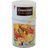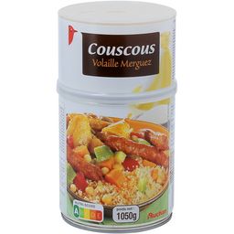 Eau, semoule de blé (contient gluten) dur précuite 23,8%, morceaux de cuisse de poulet (1) non désossées 19,8%, merguez 7,6%, (viande de dinde (1), viande de mouton (2), eau, piments, sel, arômes naturels, sirop de glucose, plasma de bœuf, stabilisant : triphosphates, épices, antioxydant : acide ascorbique.), carottes 7,1%, navets 4,2%, pois chiches réhydratés 3,8%, courgettes 3,6%, poivrons rouges et verts 2%, concentré de tomates, oignons 1%, sucre, arômes naturels (contient céleri et œuf), sel, épices (piments, coriandre, raz el hanout, cumin, poivre, carvi, ail) , gélifiants: gomme guar et gomme xanthane, colorant: extrait de paprika. Trace éventuelle de lait.Pourcentages exprimés par rapport au poids net total.(1) origine: UE - (2) origine: UE ou Hors UE.Une boite de garniture de 800g, une coupelle de 250g de semoule de blé dur précuite et un sachet d'épices moulues 0,7g.