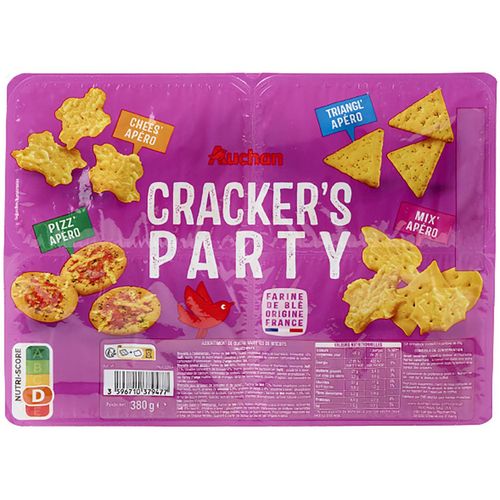 Ingrédients : Biscuits à l'emmental : Farine de BLÉ 66%, huiles végétales (colza et tournesol), emmental 18% (LAIT), sucre, sirop de sucre inverti poudres à lever: phosphates de calcium, carbonates de sodium, carbonates d'ammonium farine d'ORGE maltée, sel. Biscuits saveur pizza :Farine de BLÉ 60%,huiles végétales (colza et tournesol), emmental (LAIT) 11%, doubleconcentré de tomate 6%, sucre, poudre de lactosérum (LAIT) poudres àlever: phosphates de calcium, carbonates de sodium, carbonatesd'ammonium plantes aromatiques 1%, sel, farine d'ORGE maltée, extraitd'origan, sirop de sucre inverti, poudre d'oignon, jus concentré de carottepourpre.Biscuits aux graines de sésame et de pavot :Farine de BLÉ 73%, huiles végétales (colza et tournesol), sucre, graines de SÉSAME 4,9%, graines depavot 2,4% poudres à lever: phosphates de calcium, carbonates desodium, carbonates d'ammonium farine de BLÉ maltée 1,8%, sel, sirop de sucreinverti, épices, extrait de levure, plantes aromatiques, arôme naturel(contient BLÉ),poudre d'oignon.Biscuits salés à l'emmental : Farine de BLÉ 72%, huiles végétales (colza et tournesol), emmental (LAIT) 5%, sucre poudres à lever: phosphates de calcium, carbonates de sodium, carbonates d'ammonium sel 1,2%, farine d'ORGE maltée, sirop de sucre inverti. Pourcentages exprimés sur le total de chaque recette. Elaboré à partir de farine de blé et lait origine France.