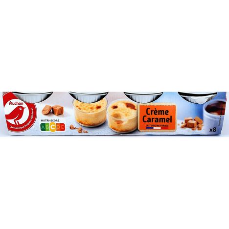 Ingrédients : LAIT demi-écrémé 62.9% , ŒUFS entiers 14.5 %, sucre, caramel 7% (sucre, eau, amidon modifié de pomme de terre épaississants : pectine, gomme xanthane) poudre de LAIT écrémé, amidon de maïs, sirop de glucose déshydraté, arôme. Traces éventuelles de blé. Elaboré à partir de lait origine France.
