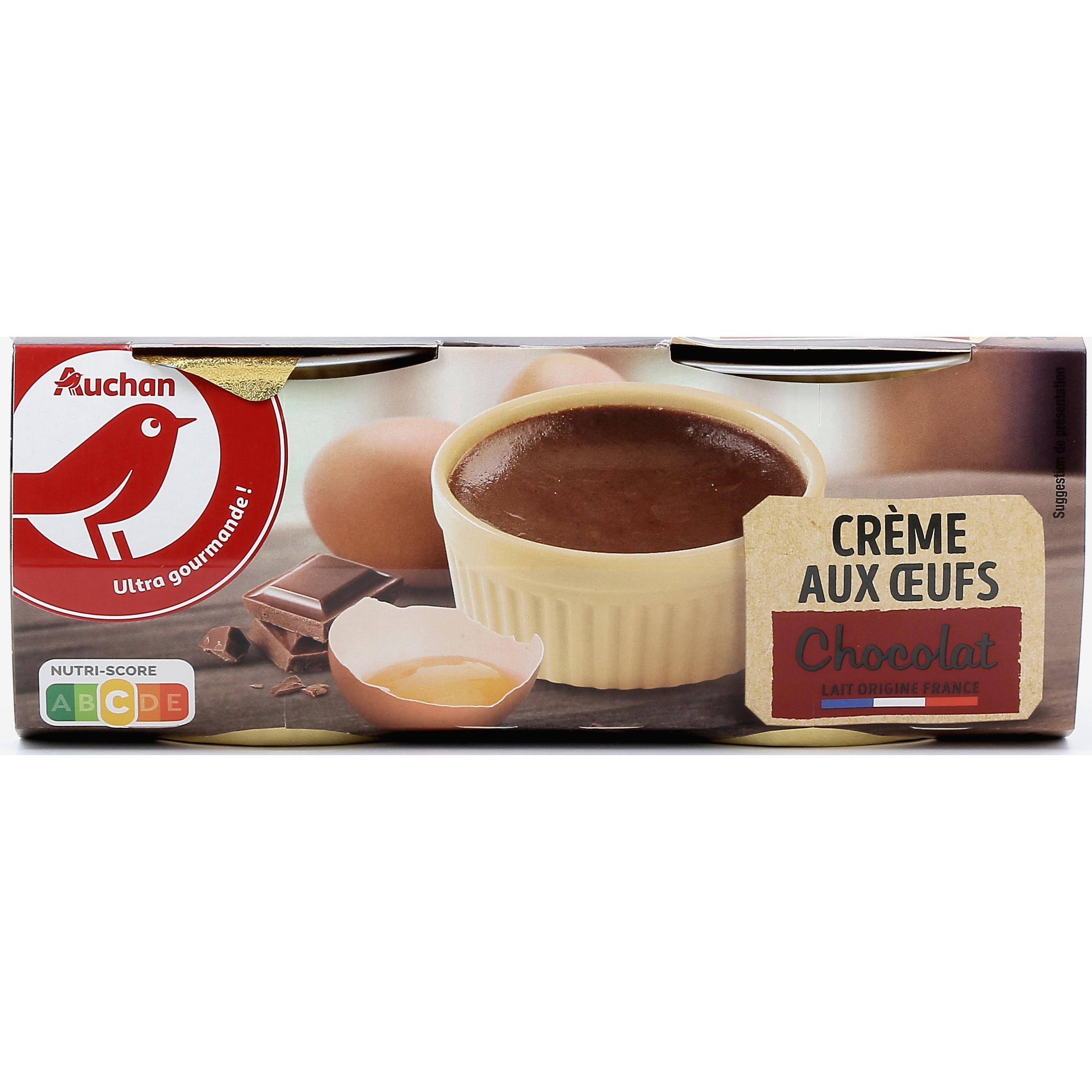 Ingrédients : LAIT écrémé 59.8%, sucre ,crème 11.3% (LAIT), oEUFS frais 10%, chocolat 2,5% (pâte de cacao,sucre, poudre de cacao maigre, émulsifiant: lécithine de tournesol ) , cacao maigre 2.5%, amidon de maïs. Elaboré à partir de lait origine France.