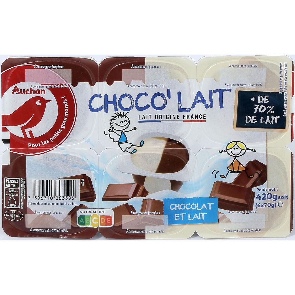 Ingrédients : LAIT écrémé 72%, sucre 10% , crème (LAIT) 7.6% , LACTOSE et minéraux du LAIT, amidon modifié de maïs, chocolat au LAIT 1,6% (sucre, pâte de cacao, LAIT entier en poudre, beurre de cacao, LAIT écrémé en poudre), chocolat en poudre 1% (sucre, cacao en poudre), épaississants: carraghénanes, gomme guar cacao maigre en poudre, protéines de LAIT. Traces éventuelles de soja Elaboré à partir de lait origine France or lait contenu dans le chocolat au lait. Fabriqué avec du chocolat ne provenant pas exclusivement de France.