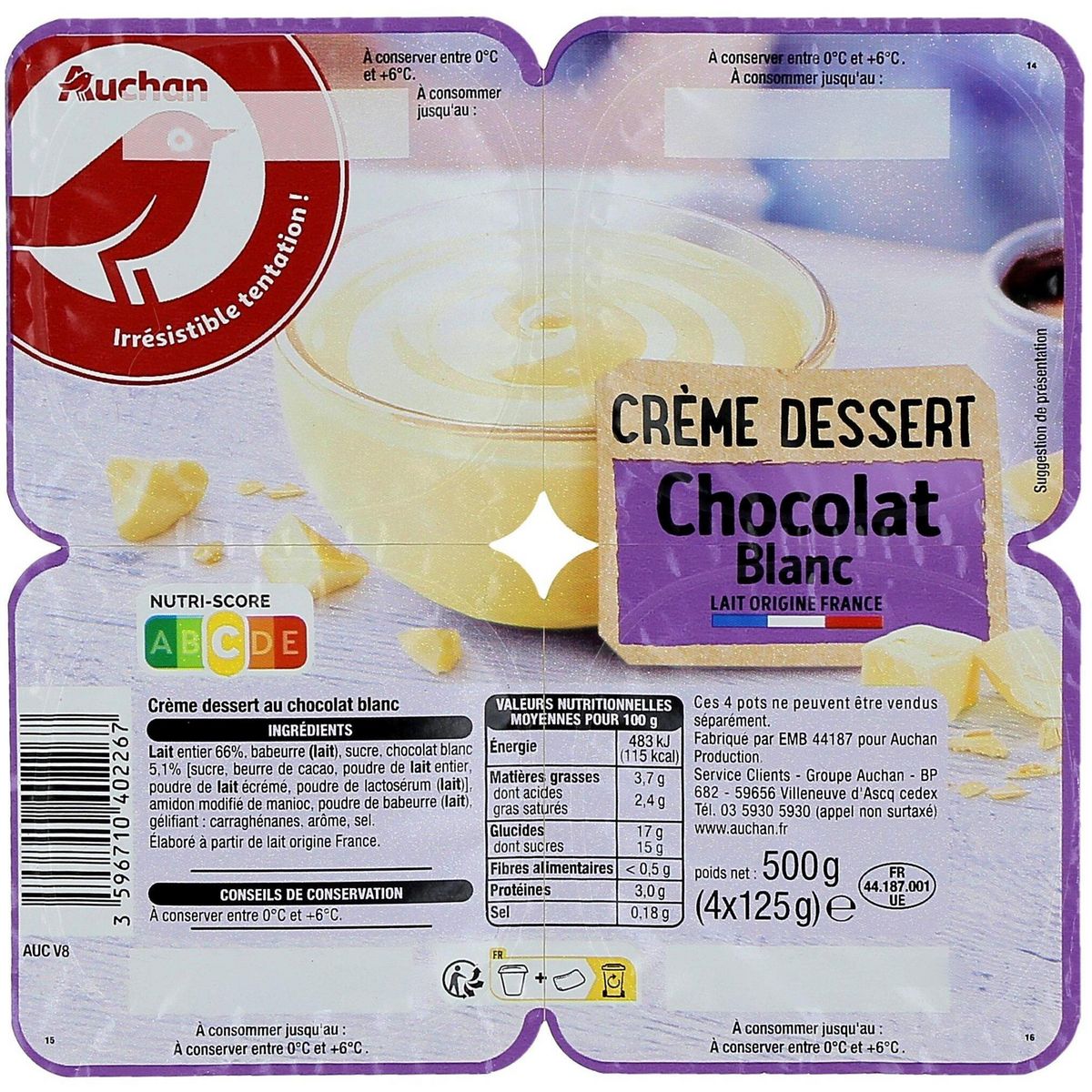 Ingrédients : Lait entier (66%), babeurre (LAIT), sucre, chocolat blanc (5,1%) [sucre, beurre de cacao, poudre de LAIT entier, poudre de LAIT écrémé, poudre de lactosérum (LAIT)], amidon modifié de manioc, poudre de babeurre (LAIT), gélifiant : carraghénanes, arôme, sel. Elaboré à partir de lait origine France.