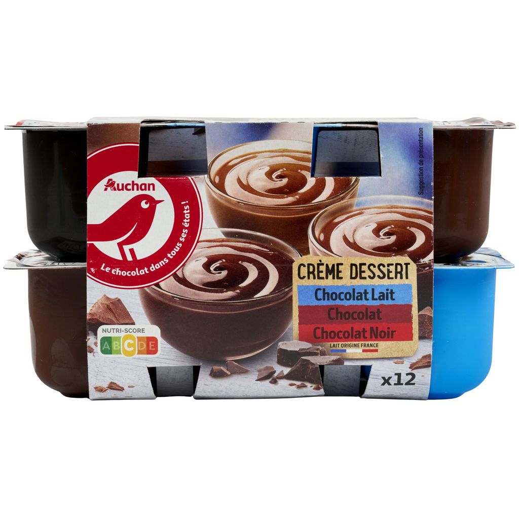 Ingrédients : Crème dessert au chocolat au LAIT : LAIT entier 70%, sucre, babeurre (LAIT), chocolat au LAIT 3% (pâte de cacao, poudre de LAIT entier 0,5%, sucre, cacao maigre), amidon modifié de manioc, cacao maigre, gélifiant : carraghénanes. Crème dessert au chocolat : LAIT entier 70%, sucre, babeurre (LAIT), cacaos maigres, amidon modifié de manioc, chocolat 2,1% (sucre, pâte de cacao), gélifiant : carraghénanes, poudre de babeurre (LAIT), sel. Crème dessert au chocolat noir : LAIT entier 70%, sucre, babeurre (LAIT), cacaos maigres, chocolat noir 2% (pâte de cacao, sucre, cacao maigre), amidon modifié de manioc, gélifiant : carraghénanes, poudre de babeurre (LAIT), sel.
